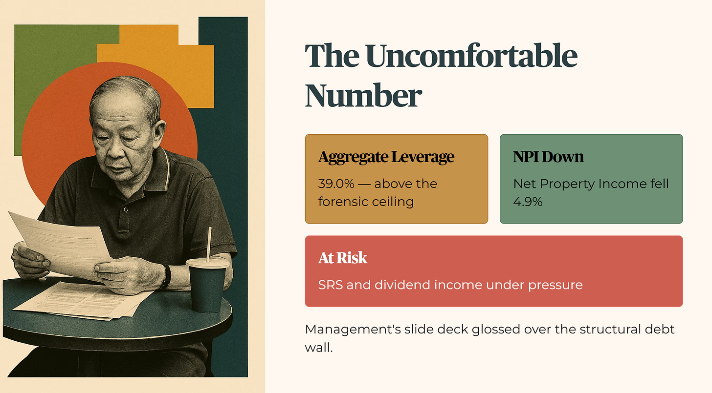 Management’s own filing states Aggregate Leverage at 39.0%, calculated under MAS Property Fund Guidelines, while Net Property Income is down 4.9%. This spike puts your SRS and dividend income at risk. The safety margin for interest payments continues to thin. This forensic audit will expose the structural debt wall management’s slide deck carefully glossed over.