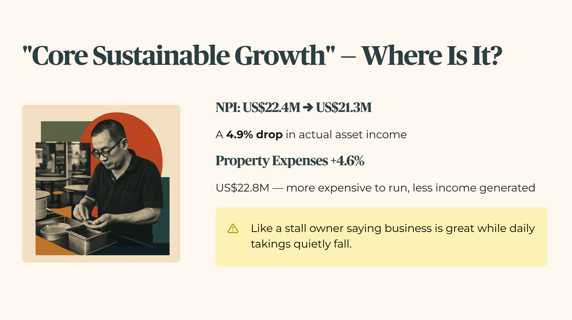 The more concerning figure is the Net Property Income. NPI — the actual profit left after paying for property taxes and maintenance, the fuel for your dividends — fell from US$22.4 million in the prior year to US$21.3 million. That is a 4.9% drop in the money actually coming from the assets. Property expenses jumped 4.6% to US$22.8 million. Management is running a more expensive operation while income from the assets shrinks. In our heartlands, this is like a stall owner telling you business is great while his daily takings are quietly going down.