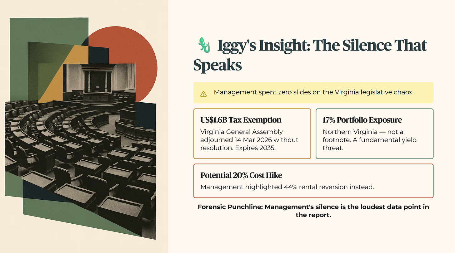 Management spent exactly zero slides discussing the legislative chaos in Northern Virginia. The Virginia General Assembly adjourned on 14 March 2026 without resolving the fate of the US$1.6 billion data centre tax exemption. This exemption expires in 2035. For a REIT with 17% of its portfolio in Northern Virginia, this is not a footnote. It is a fundamental threat to the long-term yield. Silence on this issue in the main presentation suggests management prefers to focus on the 44% rental reversion rather than the potential 20% cost hike from taxes.