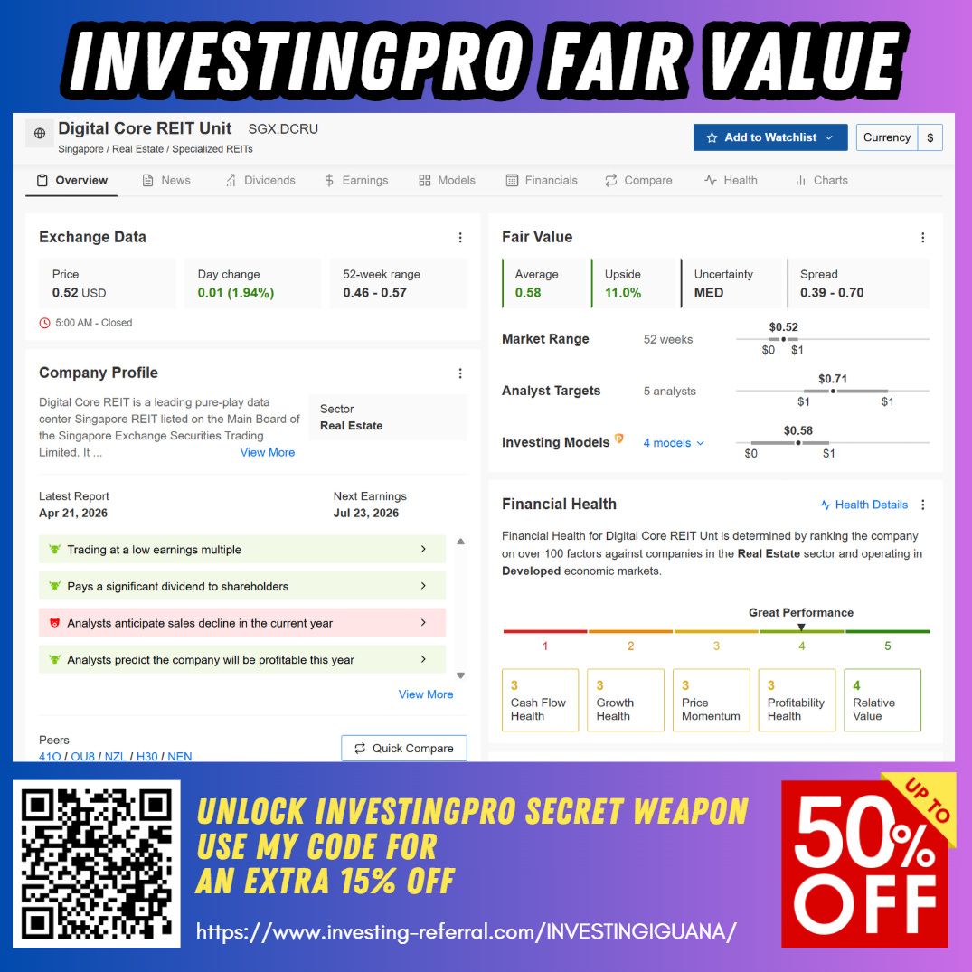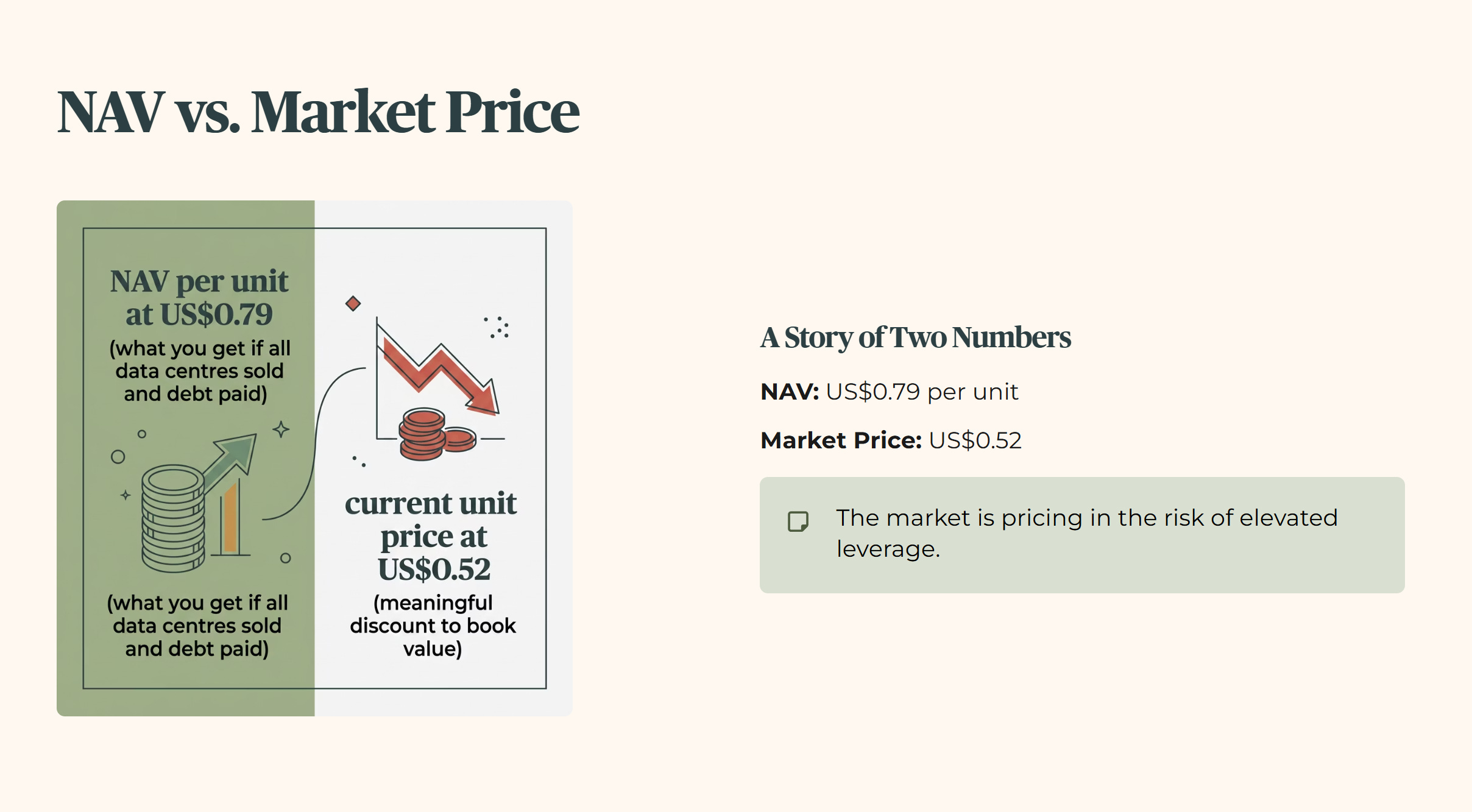 Digital Core REIT is a story of two numbers. The Net Asset Value per unit is US$0.79. NAV is what you would get if you sold all the data centres and paid off the debt today. The current unit price is US$0.52, representing a meaningful discount to book value.