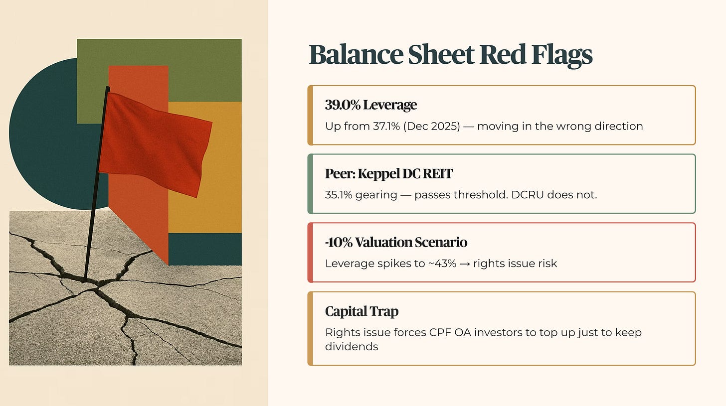 The Balance Sheet is where the forensic red flags are waving. Aggregate Leverage — total debt divided by gross asset value, measured under MAS Property Fund Guidelines — has climbed to 39.0% as stated in the management presentation for the period ending 31 March 2026.