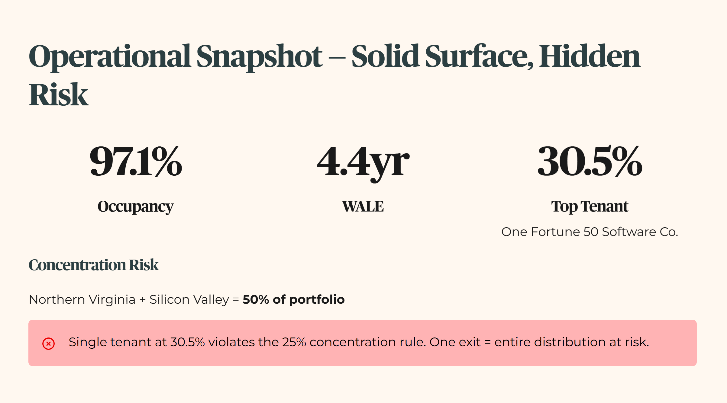 On the operational side, occupancy remains high at 97.1%. The Weighted Average Lease Expiry stands at 4.4 years — the average time until leases expire. These numbers look solid on a slide. However, the portfolio is heavily concentrated. Northern Virginia and Silicon Valley together represent 50% of the portfolio. One single Fortune 50 Software Company accounts for 30.5% of total annualised rent. This violates my 25% concentration rule for a sanctuary asset. If that one tenant moves, the entire distribution for Iggy’s Elite Investors is at risk.