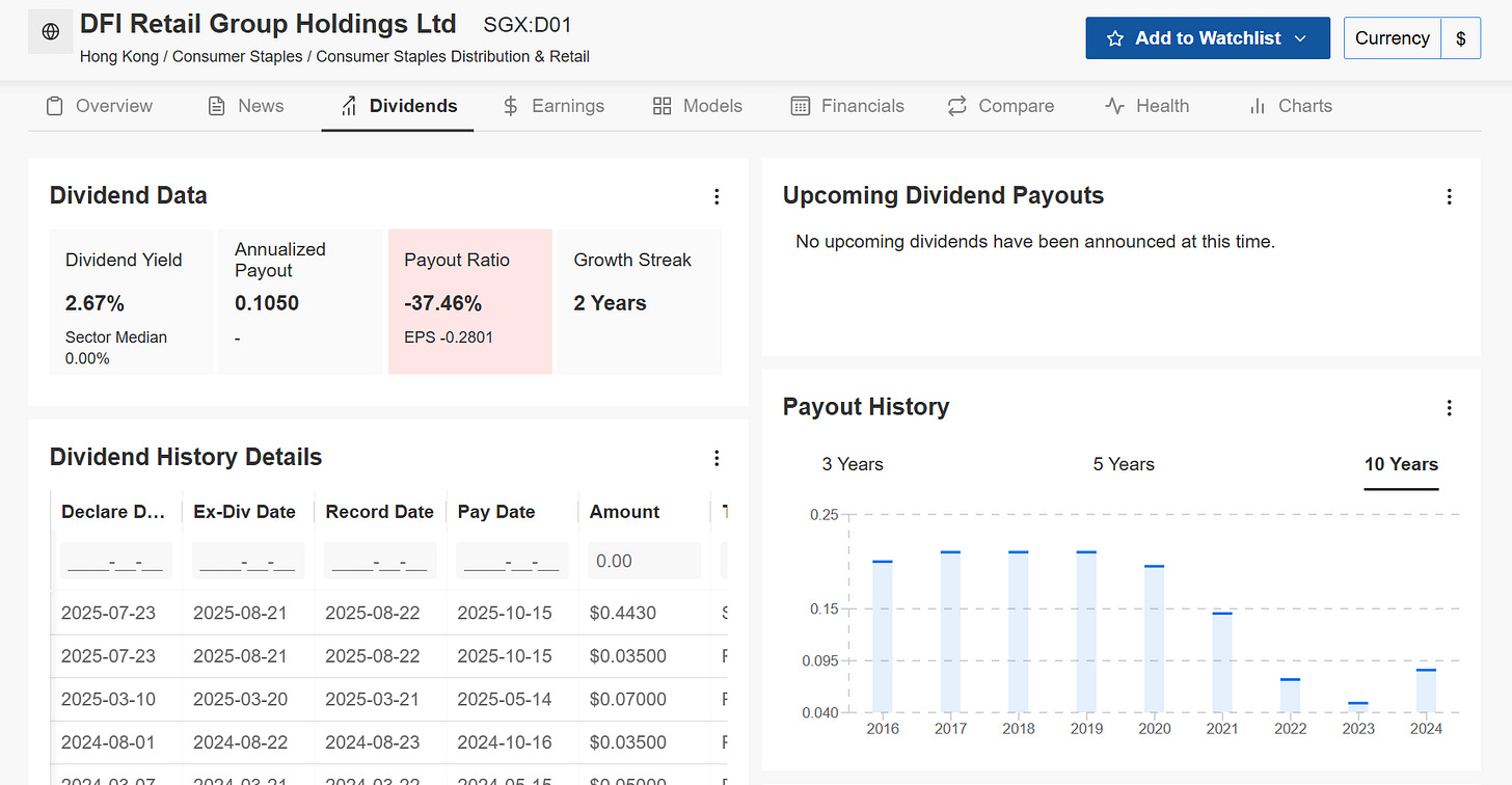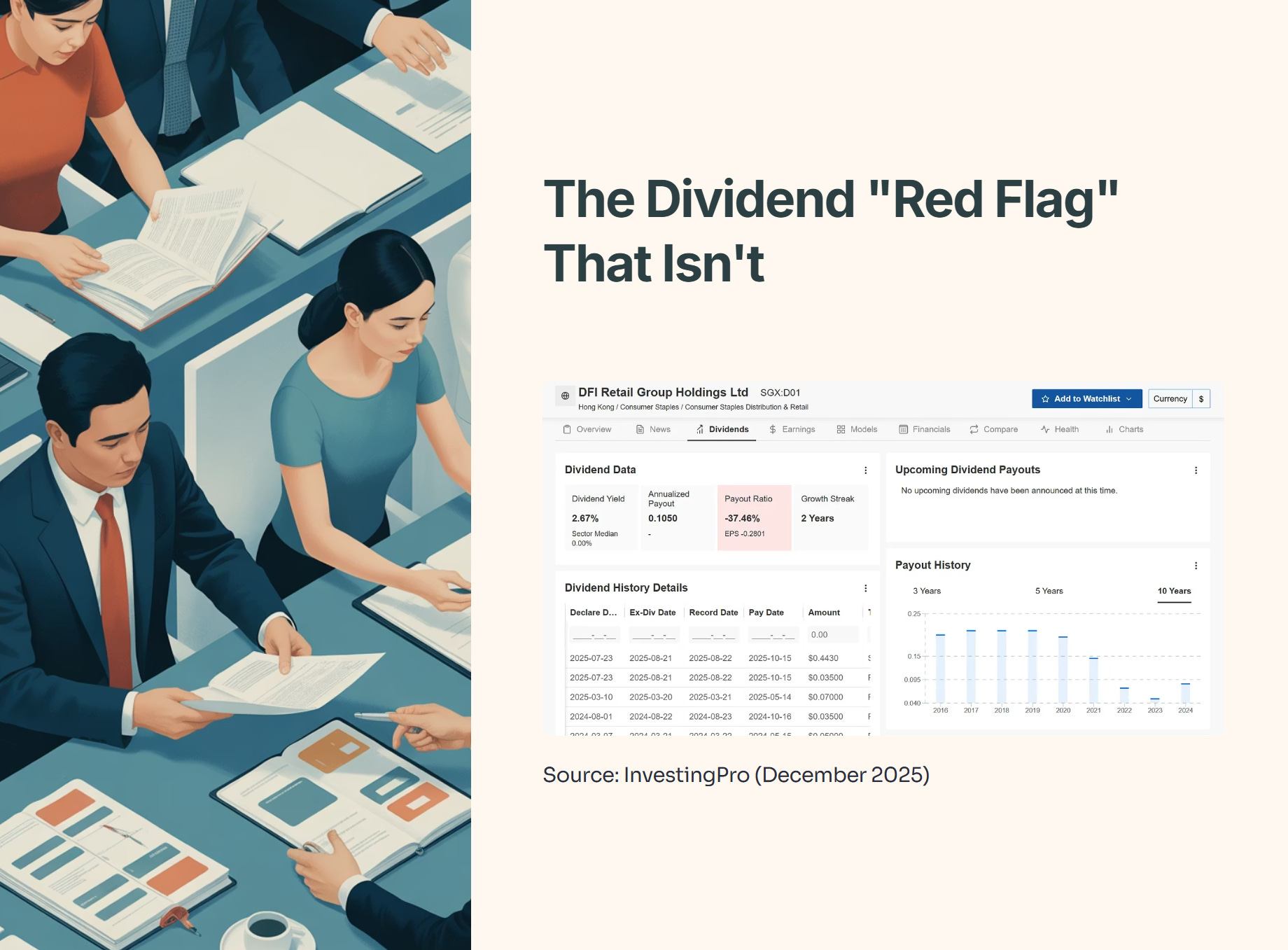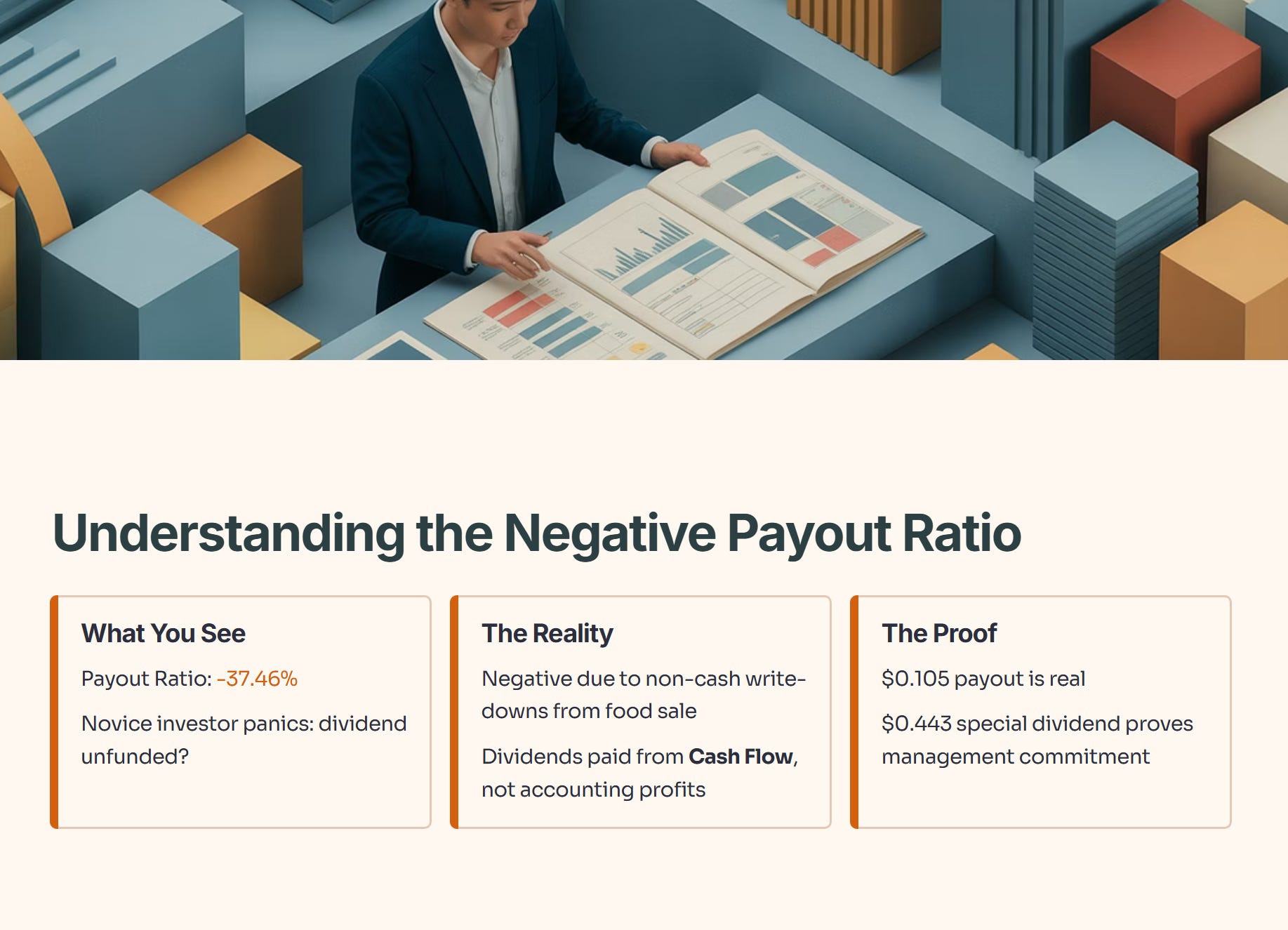 The Reality: The ratio is negative because reported earnings are negative due to non-cash write-downs from the Singapore food sale. Dividends are paid from Cash Flow, not accounting profits. The $0.105 payout is real, and the $0.443 special dividend in late 2025 proves management is willing to return cash to you.
