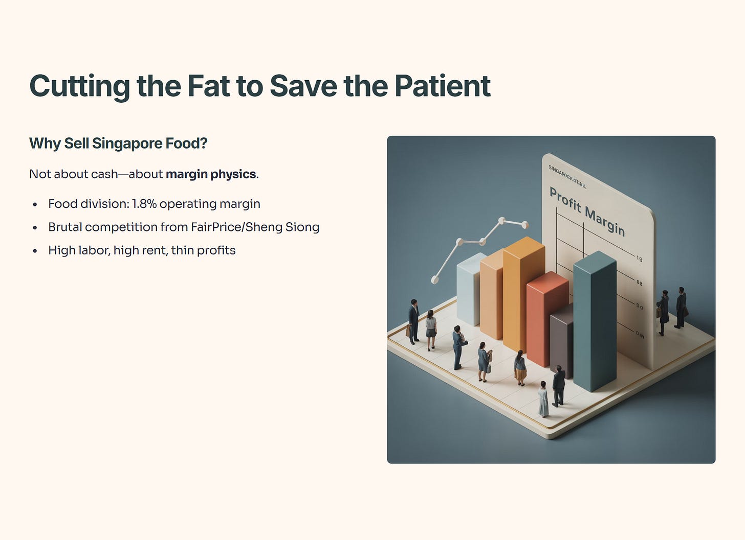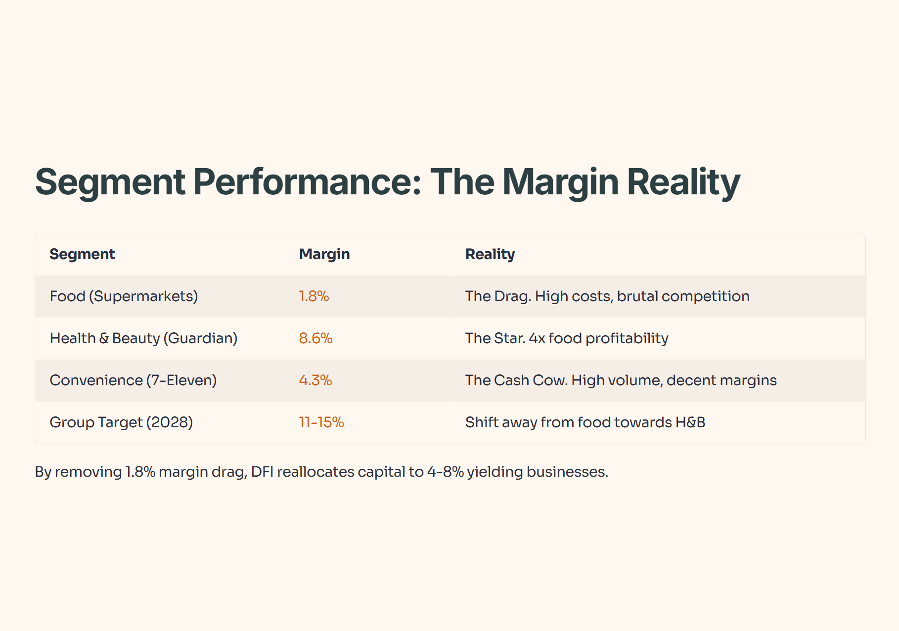 By selling the Singapore food operations, DFI isn’t losing money; they are stopping the bleeding. They are reallocating capital from a 1.8% margin business to businesses yielding 4-8%.
