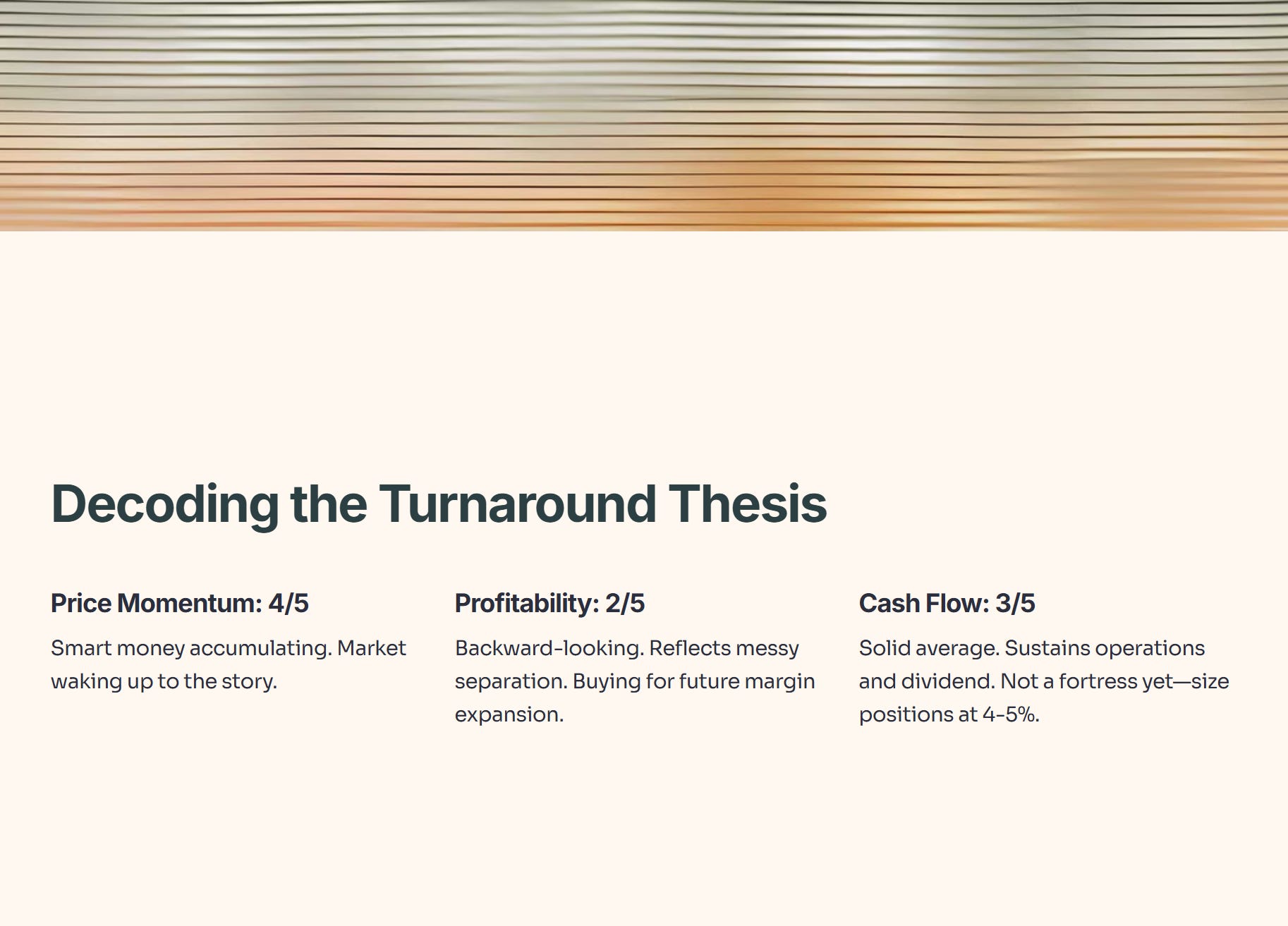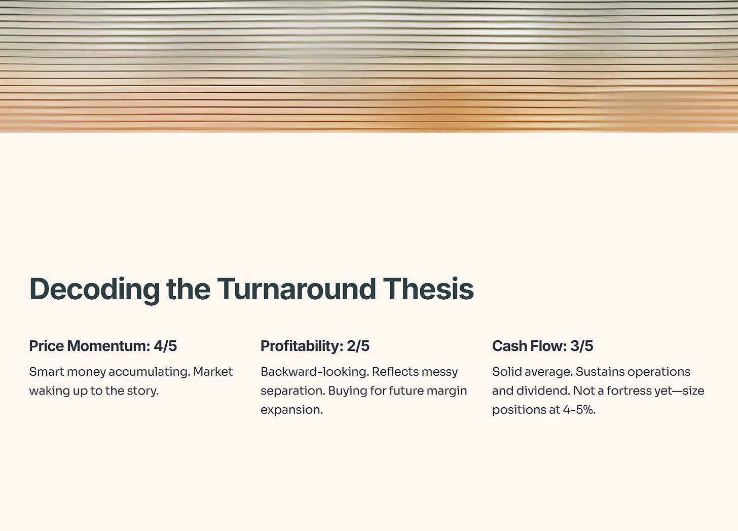 Profitability Health (2/5): This looks weak, but it’s backward-looking. It reflects the messy separation of the food business. We are buying for the future margin expansion, not the past mess.