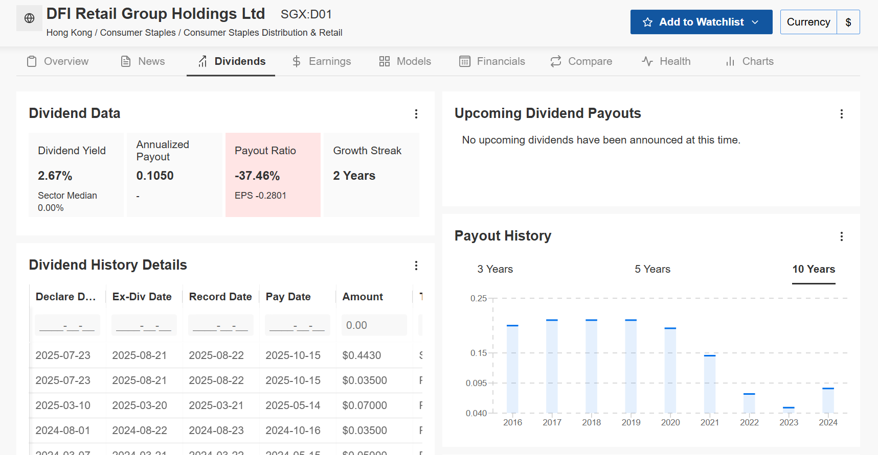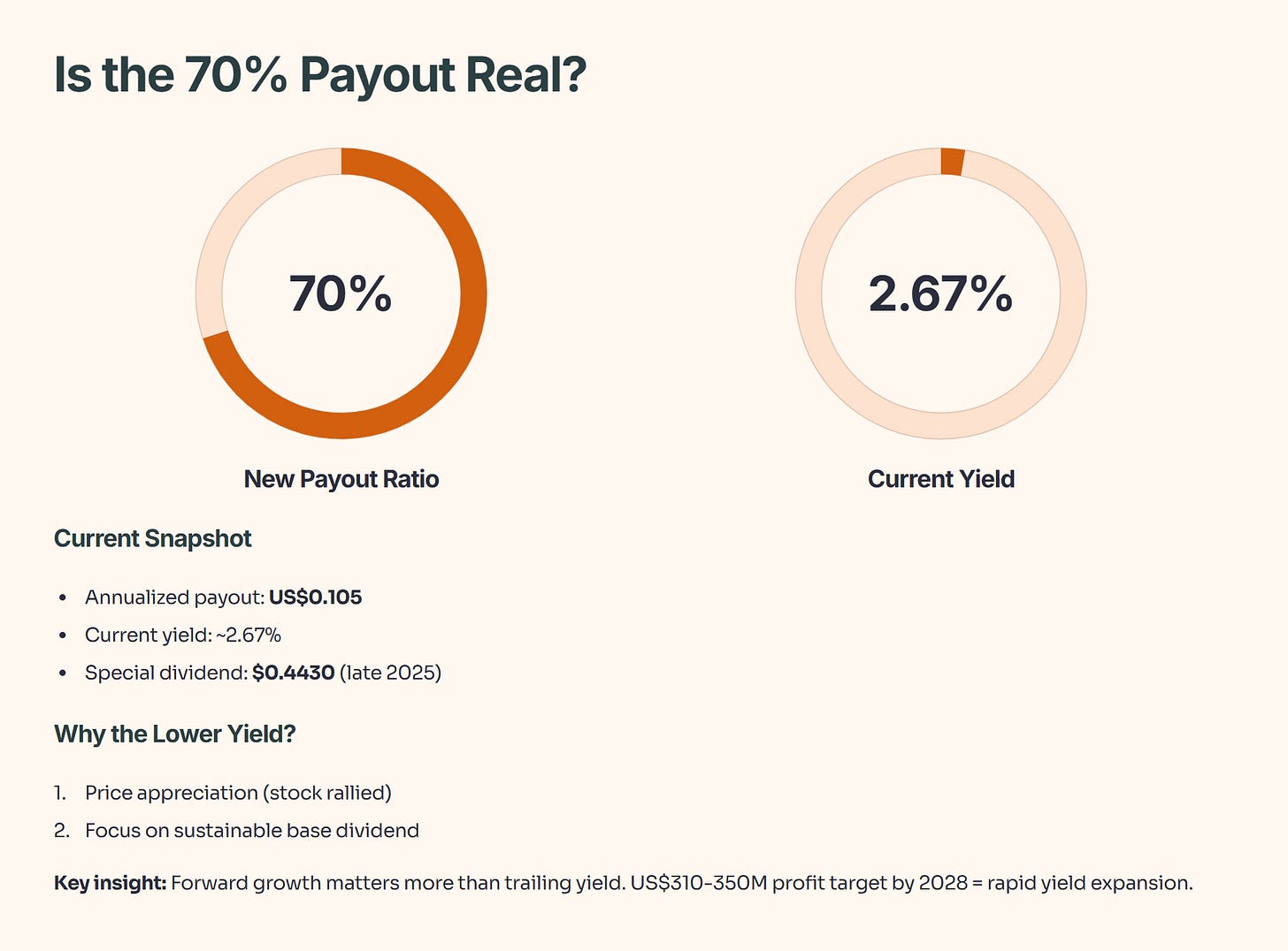 DFI has committed to increasing its dividend payout ratio from 60% to 70%. However, if you look at the raw data today, you might see a confusing picture. The current “Annualized Payout” sits at US$0.105, translating to a yield of roughly 2.67%.