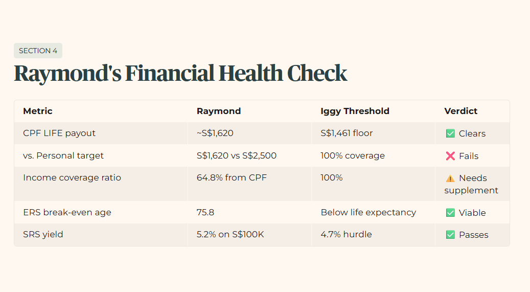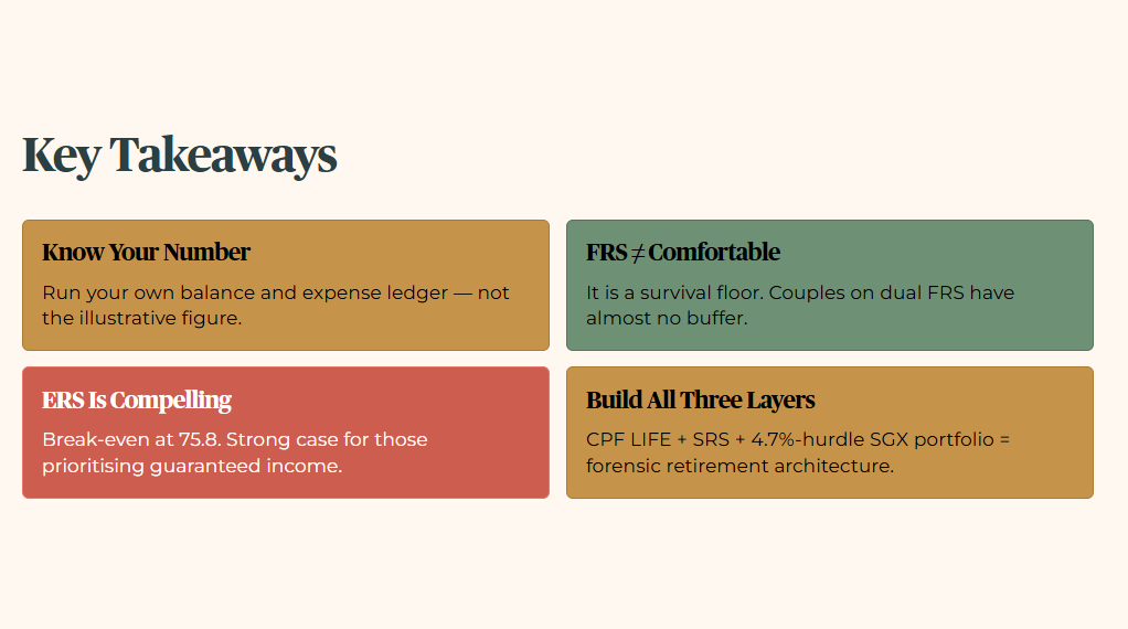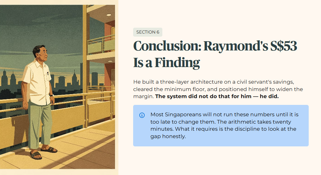 Raymond’s S$53 monthly surplus is not a failure. It is a forensic finding. He has built a three-layer retirement architecture on a civil servant’s savings, cleared the minimum floor, and positioned himself to widen the margin over the next seven years. The system did not do that for him, he did.