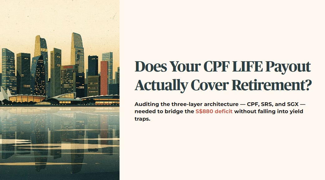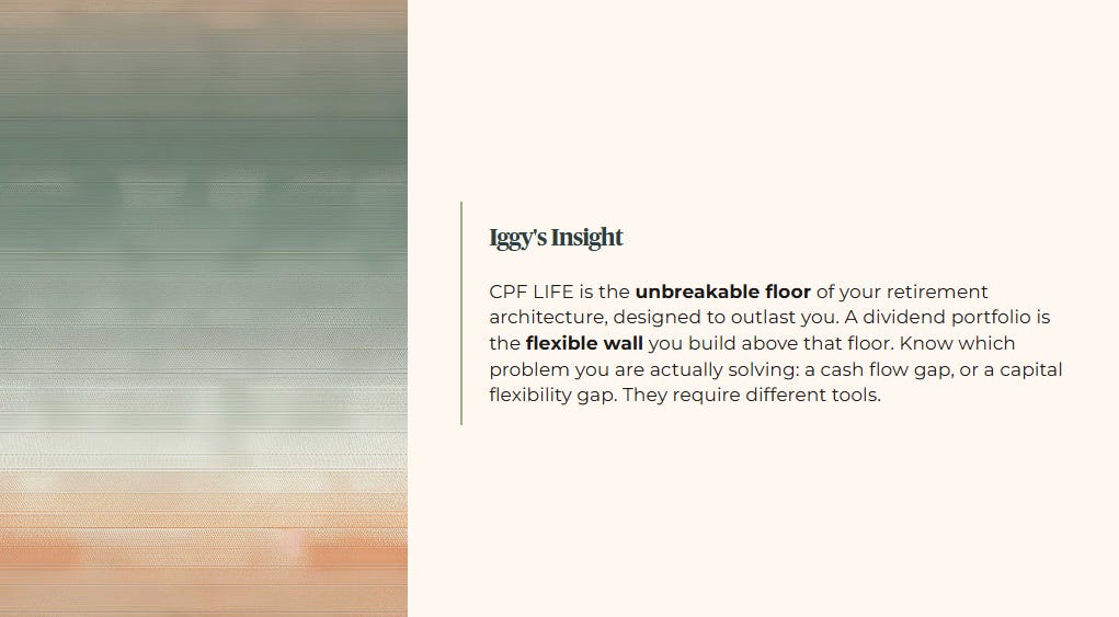 You cannot withdraw it for a medical emergency. You cannot leave it intact to your children. CPF LIFE is the unbreakable floor of your retirement architecture, designed to outlast you. A dividend portfolio is the flexible wall you build above that floor. The forensic discipline is knowing which problem you are actually solving: a cash flow gap, or a capital flexibility gap. They require different tools.