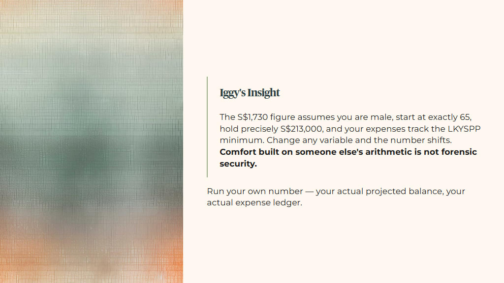 Iggy’s Insight Box 1 The CPF Board publishes payout estimates as helpful ranges, not guarantees. Most heartlanders look at the S$1,730 Standard FRS figure and feel reassured. But that number assumes you are male, you start payouts at exactly 65, your balance sits at precisely S$213,000, and your expenses track the LKYSPP minimum standard. Change any one of those variables and the number shifts. The forensic discipline here is to run your own number, your actual projected balance, your actual expense ledger, not the illustrative figure. Comfort built on someone else’s arithmetic is not forensic security.