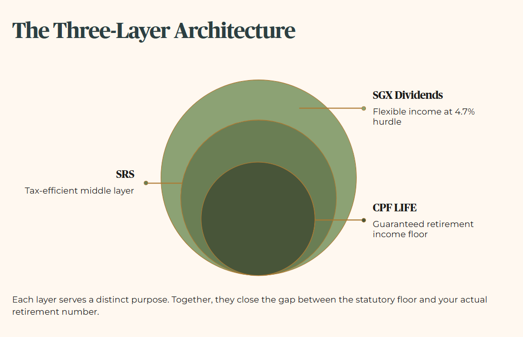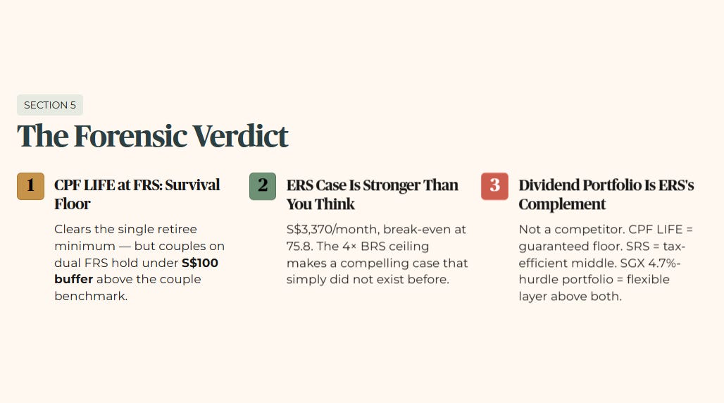 Third, the dividend portfolio is not ERS’s competitor. It is ERS’s complement. The forensic architecture is CPF LIFE as the guaranteed floor, SRS as the tax-efficient middle layer, and a 4.7%-hurdle SGX portfolio as the flexible income layer above both. Raymond’s position, marginal but structurally sound, illustrates exactly what this three-layer architecture looks like in practice for a heartlander who has done the work but not yet hit scale.