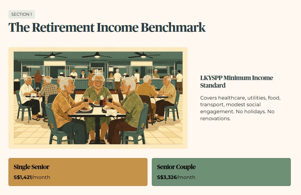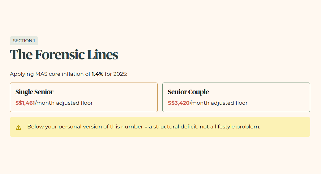 One figure to note: S$1,421 is a 2023 study figure. Applying MAS core inflation of 1.4% for 2025, the adjusted 2025 equivalent is approximately S$1,461 for a single senior, and S$3,420 for a couple. These are the forensic lines we use throughout this analysis.