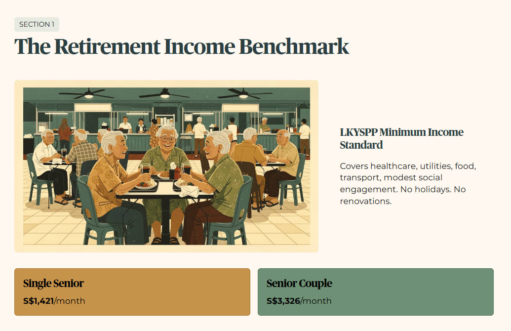 The most rigorous published benchmark for Singapore retirement adequacy comes from the Lee Kuan Yew School of Public Policy Minimum Income Standard study. It places the monthly income floor for a single senior at S$1,421. For a senior couple, that figure rises to S$3,326, not double, because of shared household costs, but close.