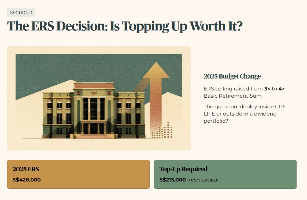 The 2025 Budget raised the Enhanced Retirement Sum ceiling from three times to four times the Basic Retirement Sum, landing the 2025 ERS at S$426,000. Topping up from FRS to ERS requires S$213,000 in fresh capital. The question is whether that capital is better deployed inside CPF LIFE or outside it in a dividend portfolio.