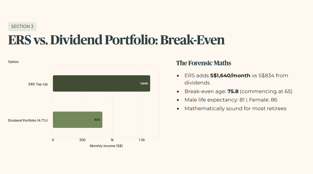 On pure monthly cash flow, ERS wins decisively. S$1,640 per month versus S$834. There is no way to construct a compliant dividend portfolio on S$213,000 that matches the ERS payout increase.
