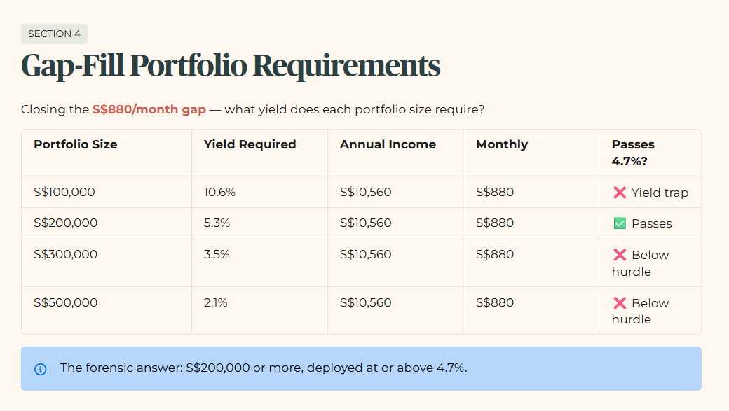 Note on Table 1B: A larger portfolio closing the same gap at a lower yield is not “worse”. It means the portfolio has surplus yield capacity. The forensic point is that any portfolio deployed below 4.7% fails the minimum hurdle regardless of size. The right answer is S$200,000 or more, deployed at or above 4.7%.