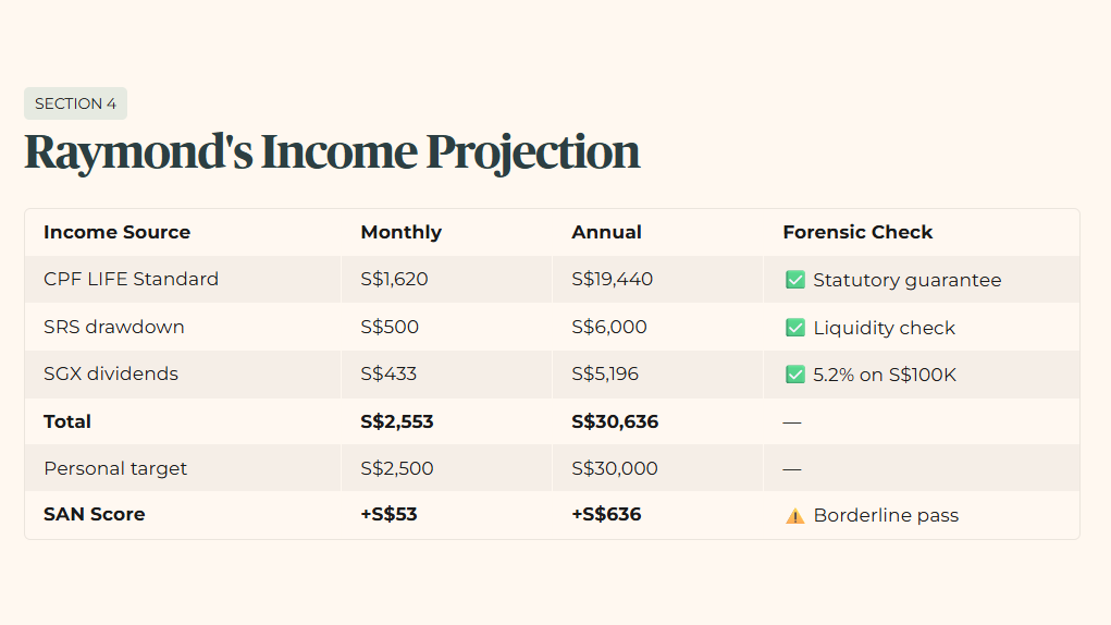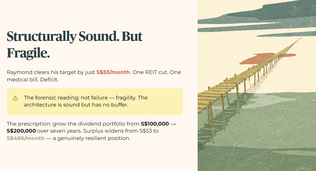 Raymond clears his personal expense target by S$53 per month. That is not a comfortable margin. One unexpected medical expense, one REIT dividend cut, one month of elevated costs, and he is in deficit. The forensic reading is not failure, it is fragility. His architecture is structurally sound but has no buffer.