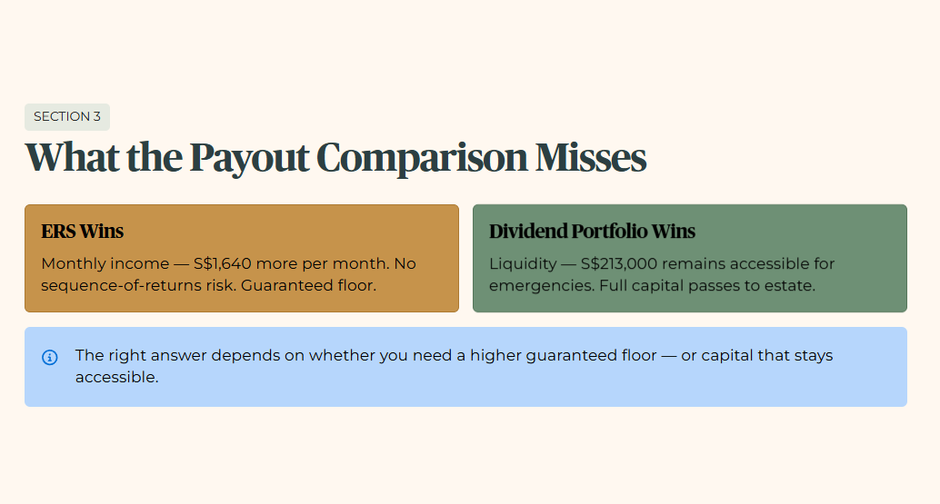 First, liquidity. The S$213,000 committed to ERS is permanently locked and cannot be redeployed if your circumstances change. A dividend portfolio retains the full capital base, available for medical emergencies, major expenses, or inheritance.