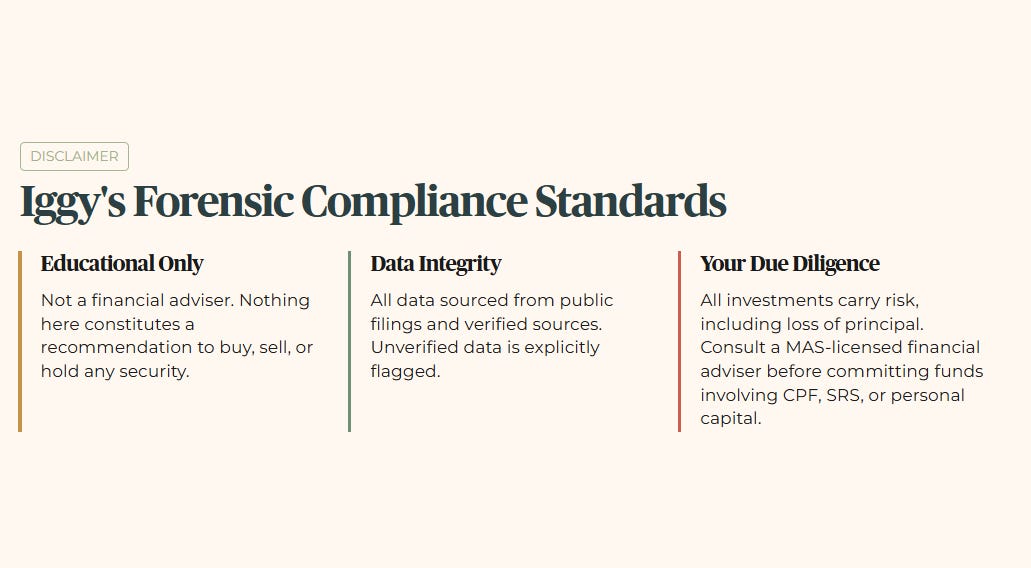 This content is produced for educational and informational purposes only. I am not a financial advisor — I am a retail investor who applies forensic analysis to my own portfolio and shares that process publicly. Nothing here constitutes a recommendation to buy, sell, or hold any security, and no specific target prices or personalised financial advice are offered. All data is sourced from public filings and verified sources; where data is unverified it is explicitly flagged. All investments carry risk, including the potential loss of principal, and past performance is not indicative of future results. If you are making investment decisions involving CPF, SRS, or personal capital, please conduct your own due diligence or consult a MAS-licensed financial adviser before committing funds.