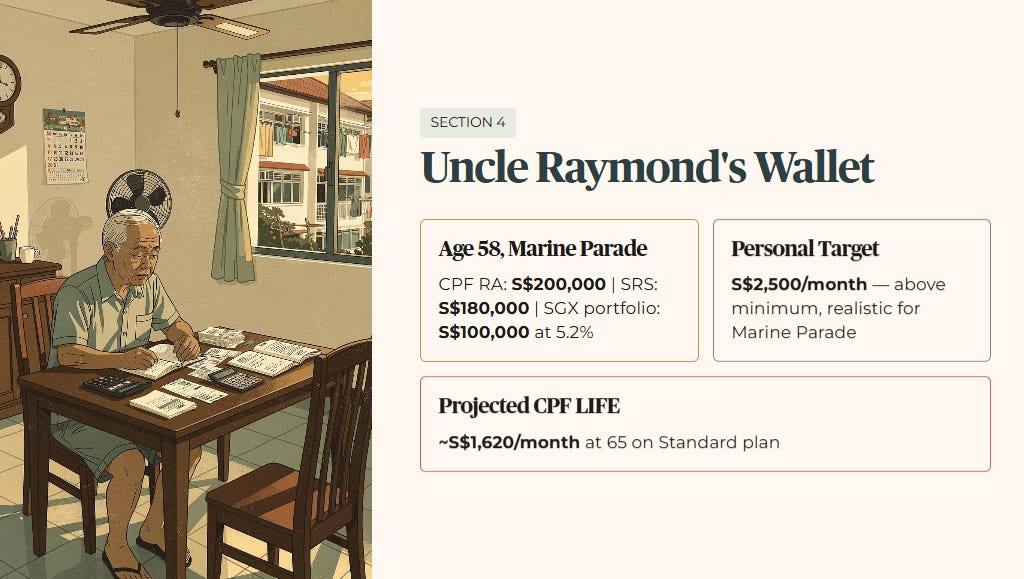Uncle Raymond is 58, a retired civil servant living in Marine Parade. His CPF Retirement Account balance sits at S$200,000, just below the 2025 FRS of S$213,000. He holds an SRS account with S$180,000 deployed and an SGX dividend portfolio generating 5.2% on a S$100,000 base. Seven years remain until his payout eligibility age.