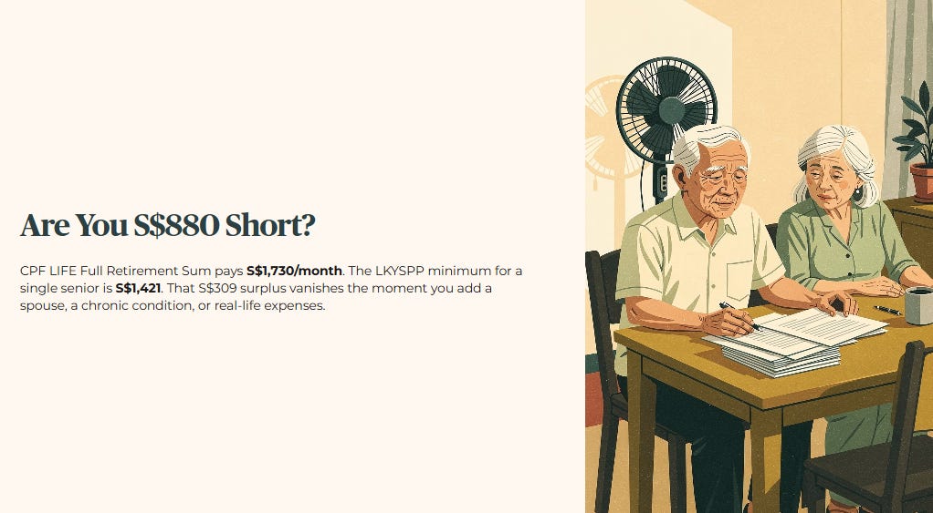 The average Singaporean retiring today on the Full Retirement Sum will receive S$1,730 a month from CPF LIFE. The LKYSPP Minimum Income Standard for a single senior is S$1,421. On paper, that looks like a S$309 surplus. But that arithmetic only holds if you are single, healthy, and your expenses match a 2023 study.