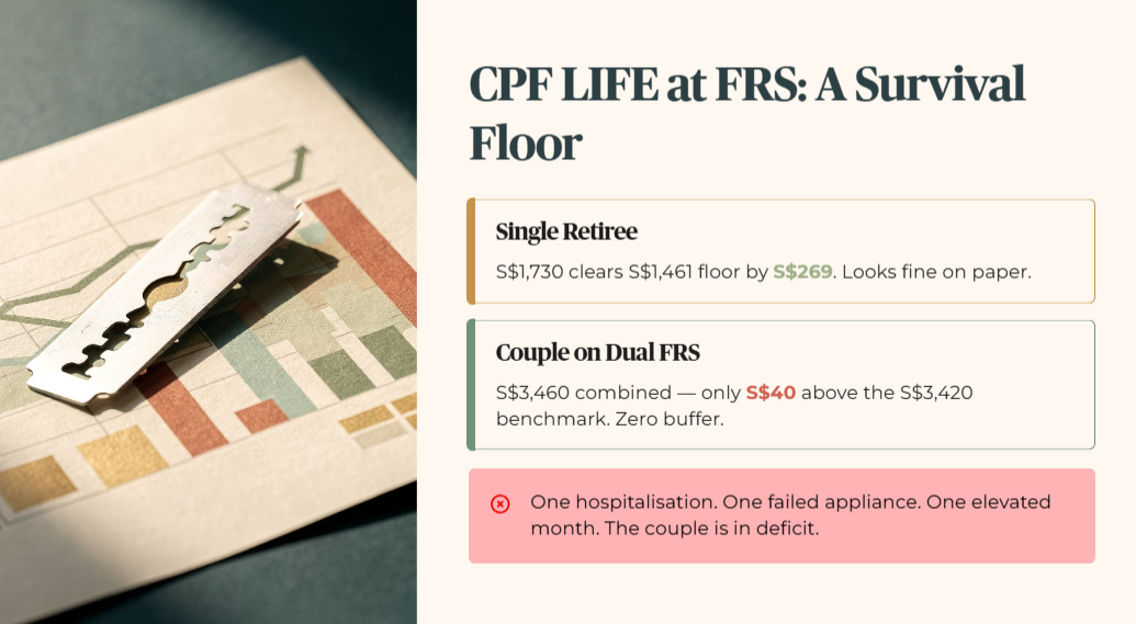 This is the forensic reality most CPF explainers skip: CPF LIFE at FRS is not a comfortable retirement income. It is a survival floor. The margin above the minimum is razor thin, and it assumes both members hit the FRS, which many couples do not.