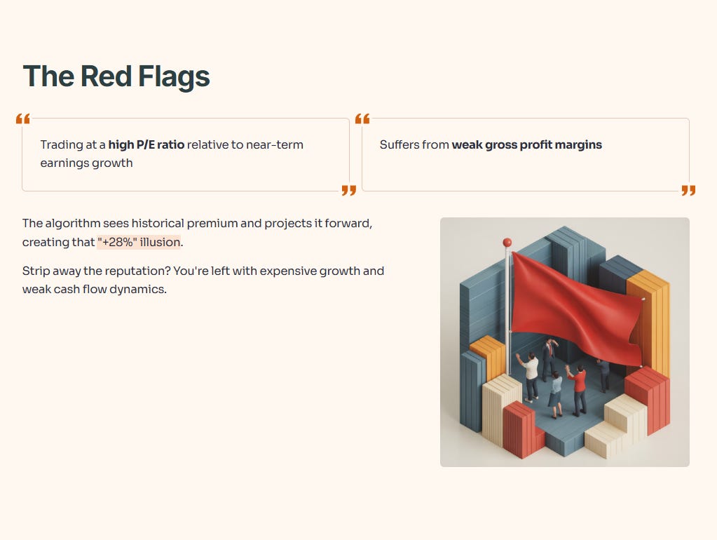 The algorithm sees the historical premium and projects it forward, creating that “+28%” illusion. But if you strip away the reputation, you are left with a stock that is expensive relative to its growth and has weak cash flow dynamics.