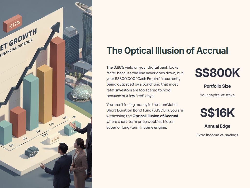The 0.88% yield on your digital bank looks “safe” because the line never goes down, but your S$800,000 “Cash Empire” is currently being outpaced by a bond fund that most retail investors are too scared to hold because of a few “red” days. You aren’t losing money in the LionGlobal Short Duration Bond Fund (LGSDBF); you are witnessing the Optical Illusion of Accrual where short-term price wobbles hide a superior long-term income engine.
