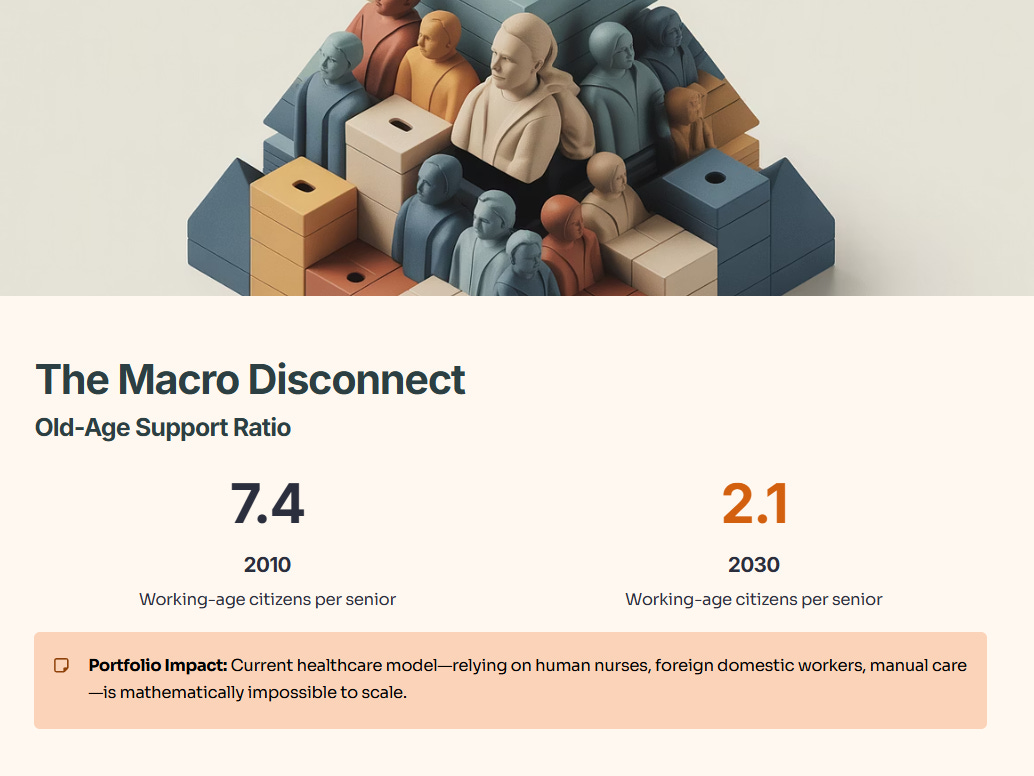 Why does this matter for your portfolio? Because the current Singaporean healthcare model—which relies heavily on human nurses, foreign domestic workers, and manual care—is mathematically impossible to scale.