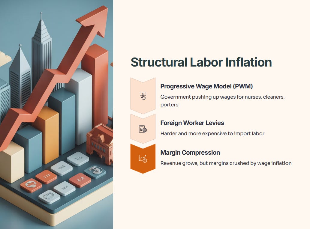 • The Progressive Wage Model (PWM): Singapore’s government is actively pushing up wages for lower-income workers (nurses, cleaners, porters).