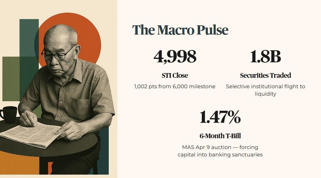 The Straits Times Index closed the week at 4,997.93, sitting in a protracted consolidation phase exactly 1,002.07 points from the psychological 6,000-point milestone. Broader market turnover reached 1.8 billion securities traded, reflecting selective institutional flight to liquidity ahead of the US-Iran ceasefire expiration. The single macro driver dictating this rotation is severe compression in short-term risk-free rates. The 6-month T-Bill yield dropped to 1.47% at the April 9 MAS auction, forcing institutional capital out of structural risk sectors and directly into high-yield banking sanctuaries.