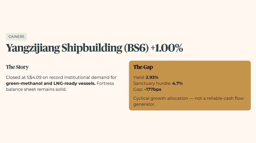 The maritime manufacturing giant closed higher at S$4.09 on record institutional demand for green-methanol and LNG-ready vessels. The fortress balance sheet remains solid. The 2.93% yield, however, fails to clear our mandatory 4.7% sanctuary hurdle. That gap forces a yield-seeking investor to sacrifice the minimum risk premium we require, explicitly marking this counter as a cyclical growth allocation rather than a reliable cash flow generator.