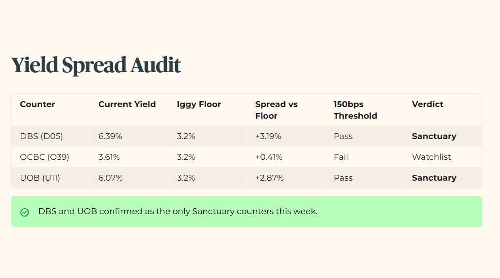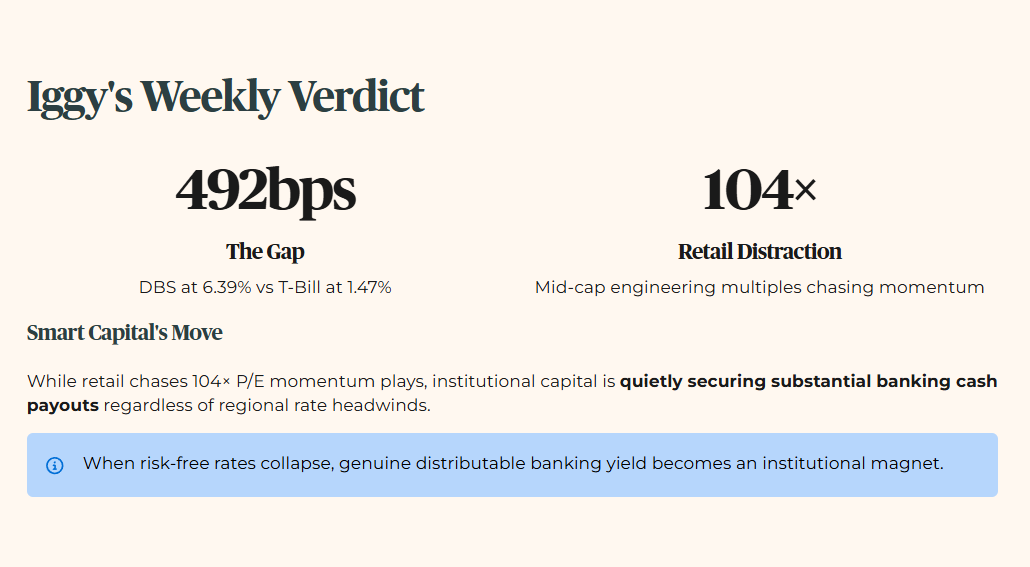 The single most critical forensic observation for your retirement architecture this week is the extreme spread exploding between the 1.47% T-Bill and DBS at 6.39%. That is a 492 basis point gap. When the risk-free rate collapses this sharply, the premium placed on genuine, distributable banking yield becomes an institutional magnet. While retail participants remain dangerously distracted by aggressive price momentum in mid-cap engineering plays carrying 104x multiples, smart capital is quietly securing substantial cash payouts regardless of regional rate headwinds. This dynamic directly confirms our Wealth Management Hegemony thesis from the operational log. Do not get blinded by capital appreciation in companies carrying a suffocating debt load or a negligible yield. The sanctuary gap has rarely been this wide.
