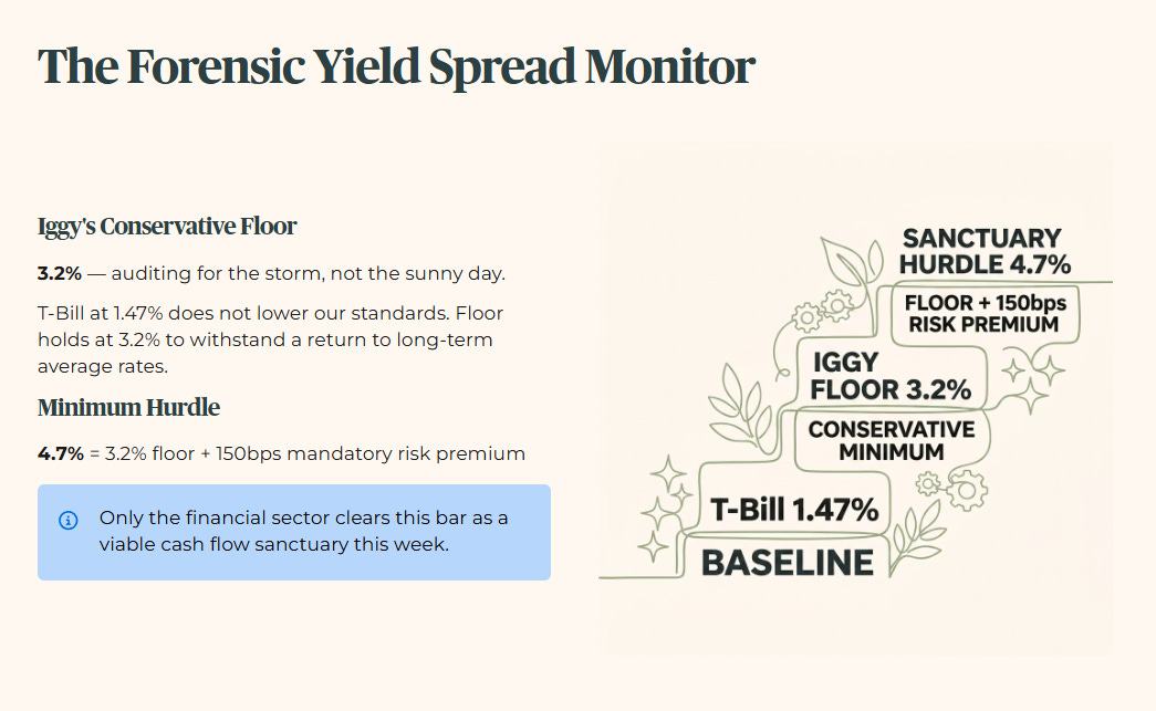 For this audit, I apply a conservative floor of 3.2%. We audit for the storm, not just the sunny day. While the T-Bill sits at 1.47%, I do not lower my standards to match a temporary market dip. My floor remains at 3.2% to ensure sanctuary assets can withstand a return to long-term average interest rates. The minimum yield hurdle is 4.7% — that is the 3.2% floor plus 150 basis points of mandatory risk premium.