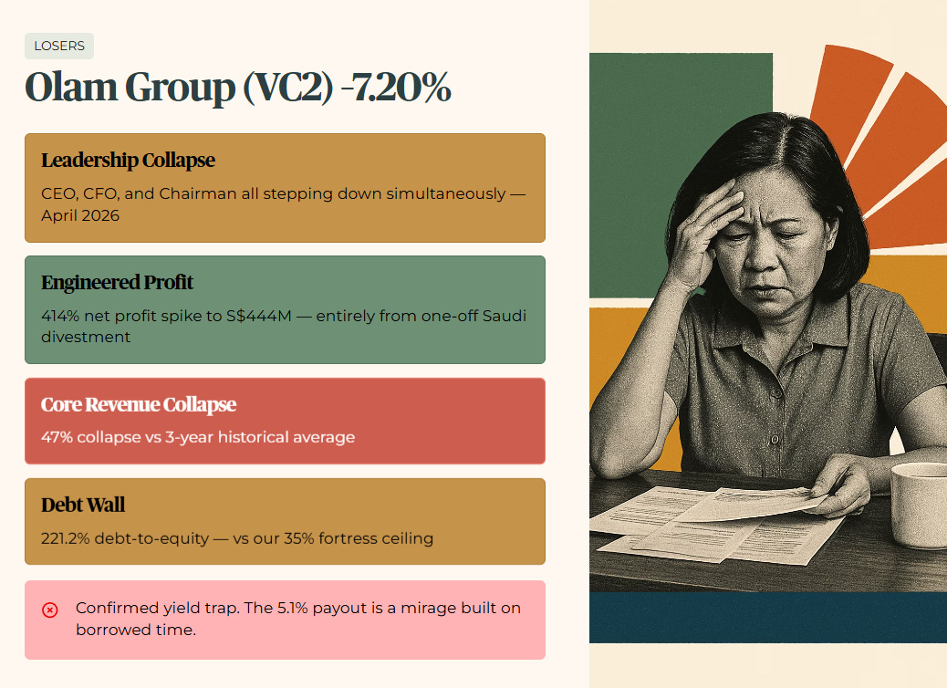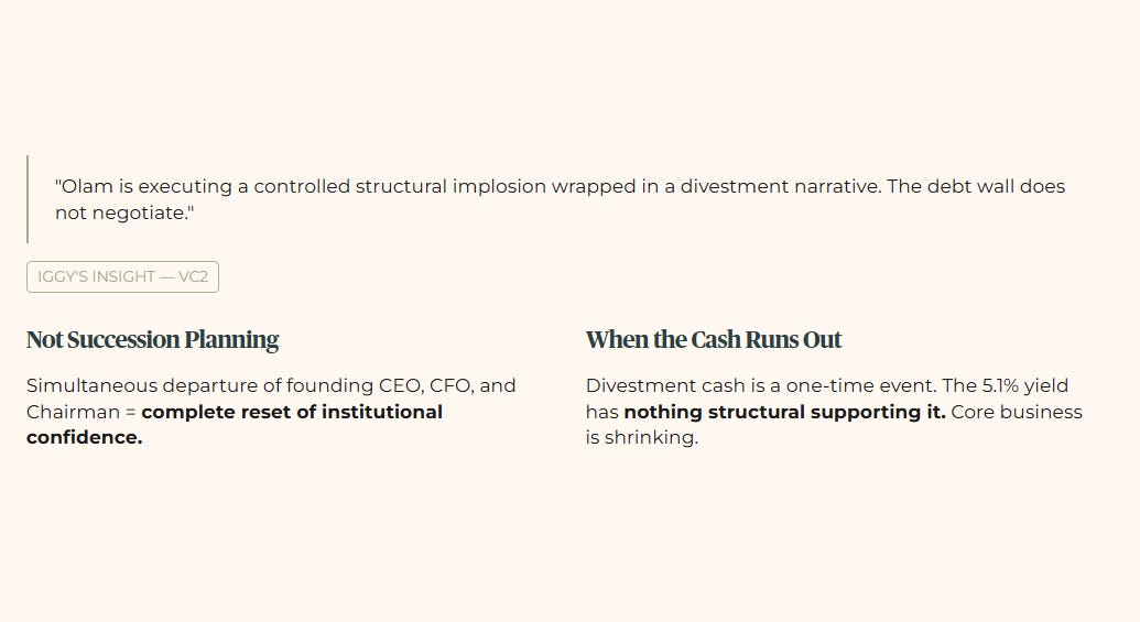 Olam is executing a controlled structural implosion wrapped in a divestment narrative. The simultaneous departure of the founding CEO, CFO, and Chairman is not routine succession planning. It is a complete reset of institutional confidence in the original high-leverage growth model. A 414% profit spike built on a one-off Saudi sale, layered on top of a 221.2% debt-to-equity ratio, is not a recovery signal. It is a one-time event that flatters the headline while the core business shrinks. When the divestment cash runs out, that 5.1% yield has nothing structural supporting it. The debt wall does not negotiate.