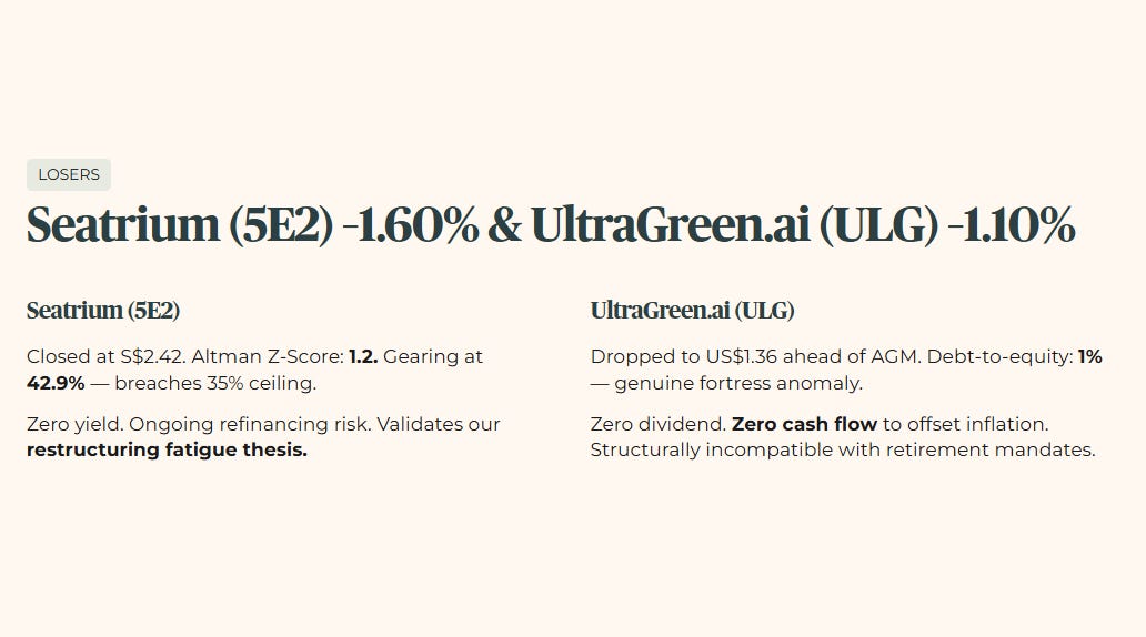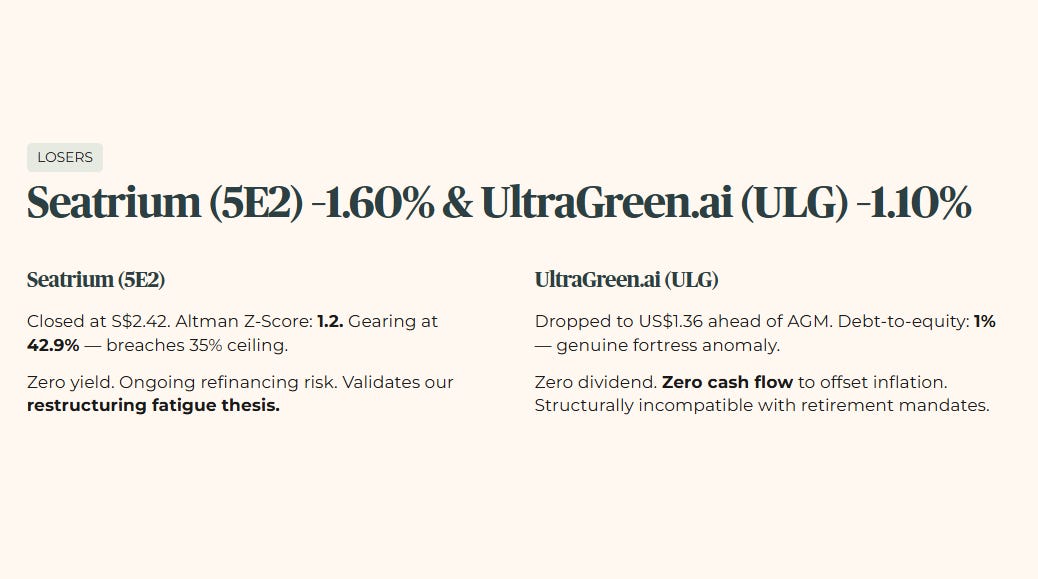 Seatrium declined 1.6% to close at S$2.42, maintaining an Altman Z-Score of 1.2 amid broad profit-taking ahead of regional geopolitical deadlines. Gross gearing sits at 42.9% debt-to-equity, comfortably breaching our 35% fortress ceiling. This price contraction validates our active restructuring fatigue thesis. The counter provides zero yield while exposing retirement capital to unacceptable institutional volatility and ongoing refinancing risk.
