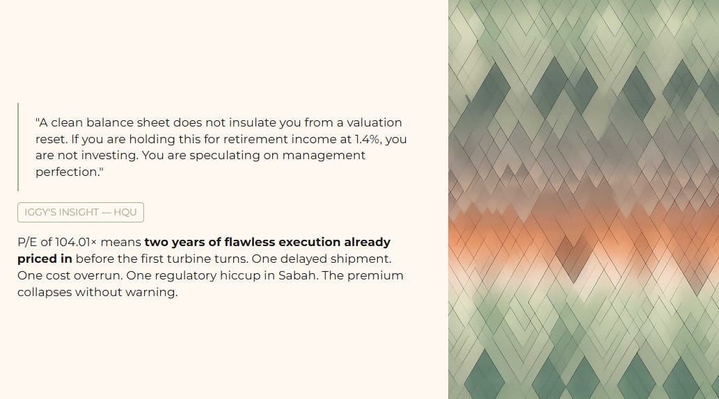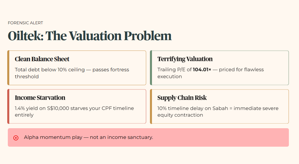 Oiltek presents the sharpest forensic contradiction on the local bourse this week. The balance sheet is genuinely clean. The valuation is genuinely terrifying. A trailing P/E of 104.01x means the market has already priced in two years of flawless execution before the first turbine turns. One delayed shipment, one cost overrun, one regulatory hiccup in Sabah, and that premium collapses without warning. A clean balance sheet does not insulate you from a valuation reset. If you are holding this for retirement income at 1.4%, you are not investing. You are speculating on management perfection.