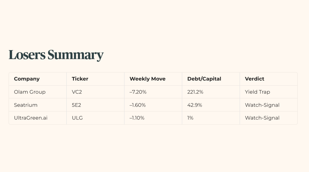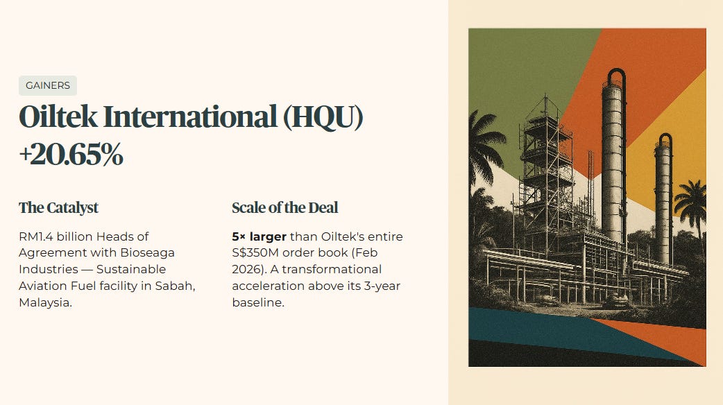 Oiltek PE 104x Valuation Reset Alert | SGX Weekly Gainers & Losers 19 Apr 2026 |