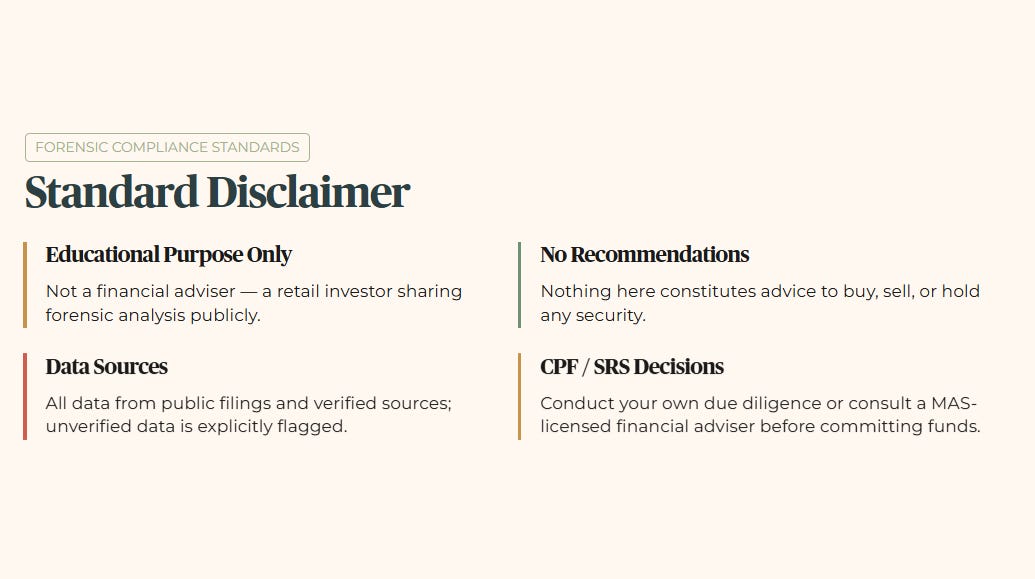 This content is produced for educational and informational purposes only. I am not a financial advisor — I am a retail investor who applies forensic analysis to my own portfolio and shares that process publicly. Nothing here constitutes a recommendation to buy, sell, or hold any security, and no specific target prices or personalised financial advice are offered. All data is sourced from public filings and verified sources; where data is unverified it is explicitly flagged. All investments carry risk, including the potential loss of principal, and past performance is not indicative of future results. If you are making investment decisions involving CPF, SRS, or personal capital, please conduct your own due diligence or consult a MAS-licensed financial adviser before committing funds.