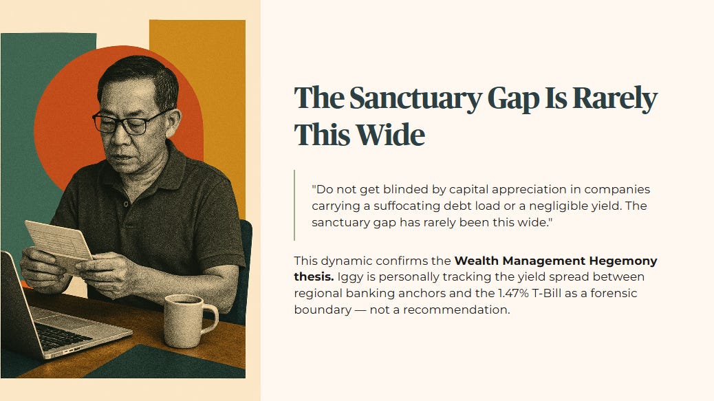 For my own portfolio construction, I am tracking the yield spread between regional banking anchors and the 1.47% T-Bill. This is a personal forensic boundary, not a recommendation.