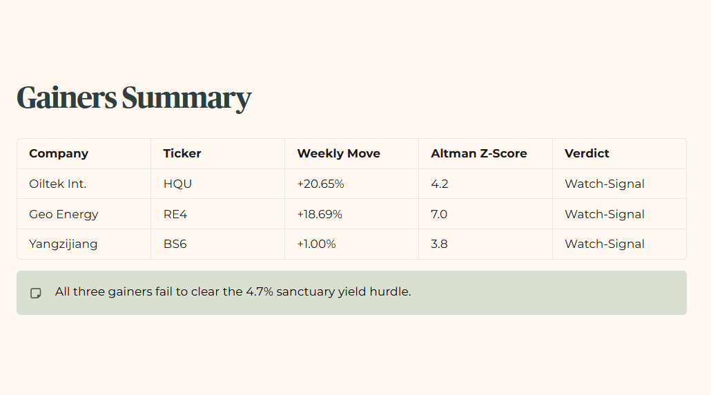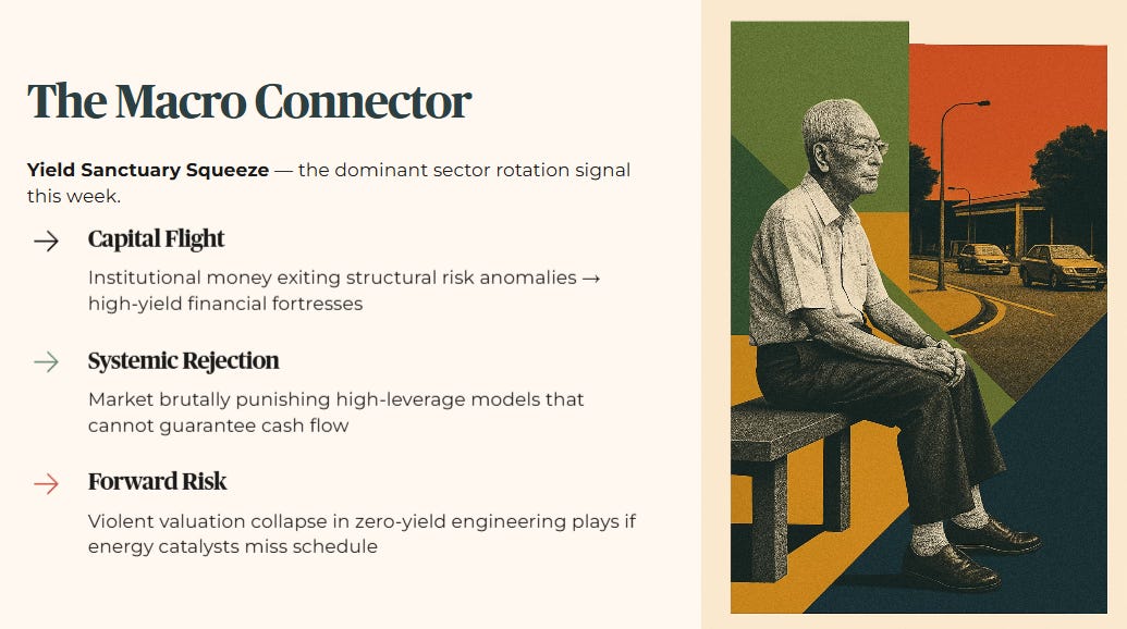 This week’s movers broadcast a clear sector rotation signal: the Yield Sanctuary Squeeze. Institutional capital is aggressively moving out of structural risk anomalies and into high-yield financial fortresses. And let’s be honest, they are not wrong. The broader market is paying an extreme premium for zero-debt industrial growth while brutally punishing endless corporate restructuring cycles. We are witnessing a systemic rejection of high-leverage business models in an environment that demands absolute cash flow certainty. The forward risk is a sudden, violent valuation collapse in these zero-yield engineering anomalies if regional energy catalysts fail to materialise exactly on schedule.