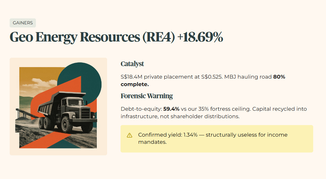Geo Energy received approval for an S$18.4 million private placement at S$0.525 while achieving 80% completion on its MBJ hauling road project. The company carries a 59.4% debt-to-equity ratio against our 35% fortress ceiling, indicating that heavy capital is being continuously recycled into infrastructure rather than shareholder distributions. The confirmed 1.34% yield is structurally useless for income mandates, exposing your capital to construction delay risk without compensating you adequately for the leverage carried.