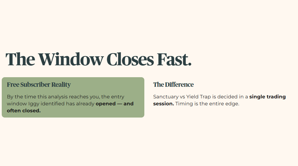 The Window Closes Fast. In this market, the difference between a “Sanctuary” and a “Yield Trap” is decided in a single trading session. By the time this analysis reaches you as a free subscriber, the entry window Iggy identified has already opened — and often closed.