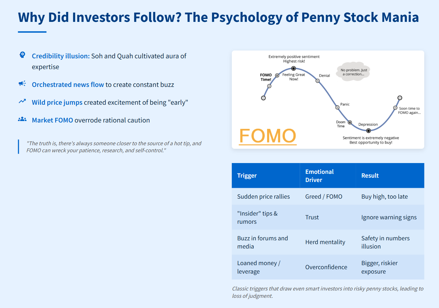 It’s easy—in hindsight—to blame “greedy” investors. But real life is messier. Soh and Quah cultivated an aura of credibility and market expertise. They whispered to the right circles, orchestrated constant news flow, and propped up prices just long enough for latecomers to believe it was “safe.” The market’s collective FOMO took over.