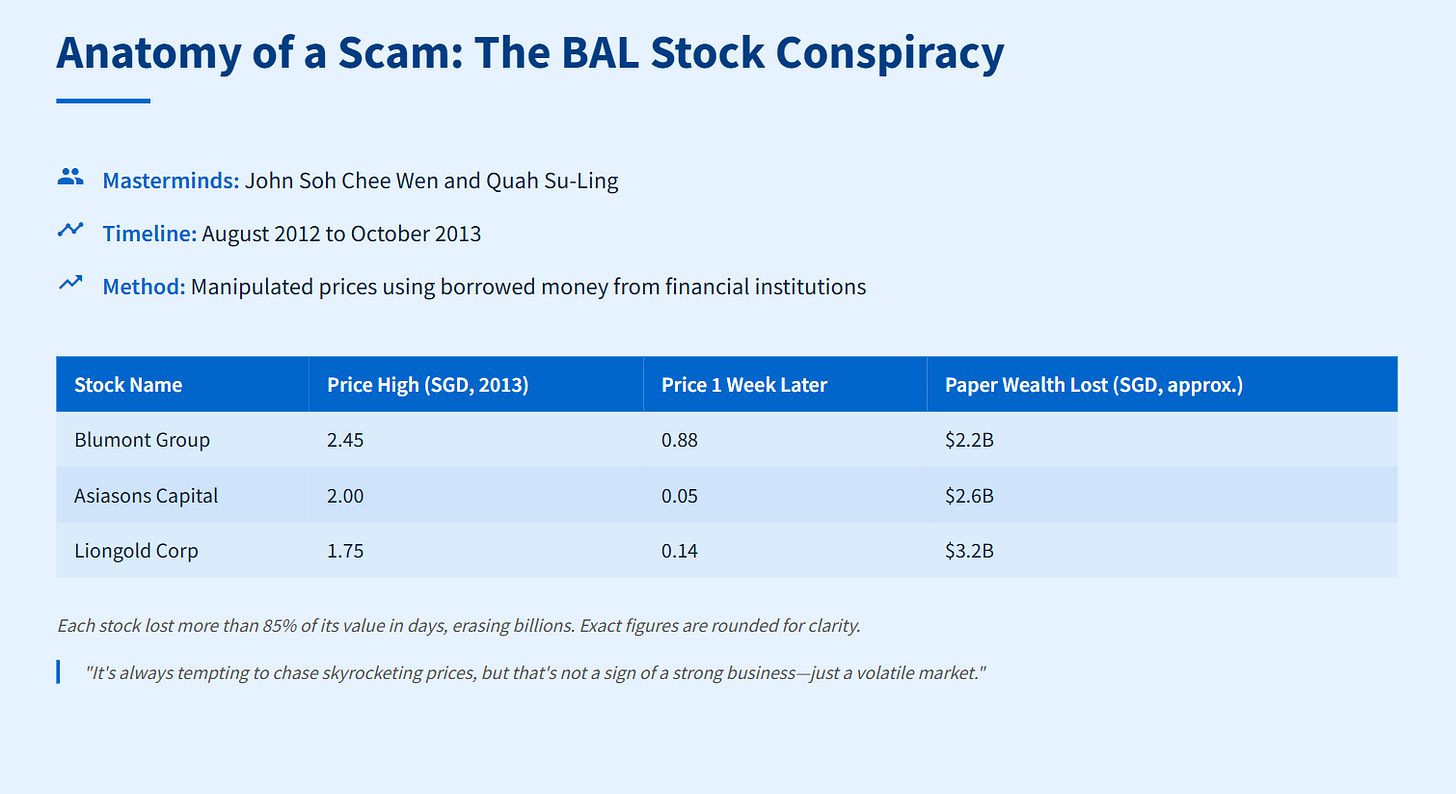 These shares (often called the “BAL stocks”) weren’t household names, but they generated a dramatic buzz. Soh and Quah created the illusion of success, using slick trading patterns and rumours of “institutional support” to lure in both retail investors and big players.