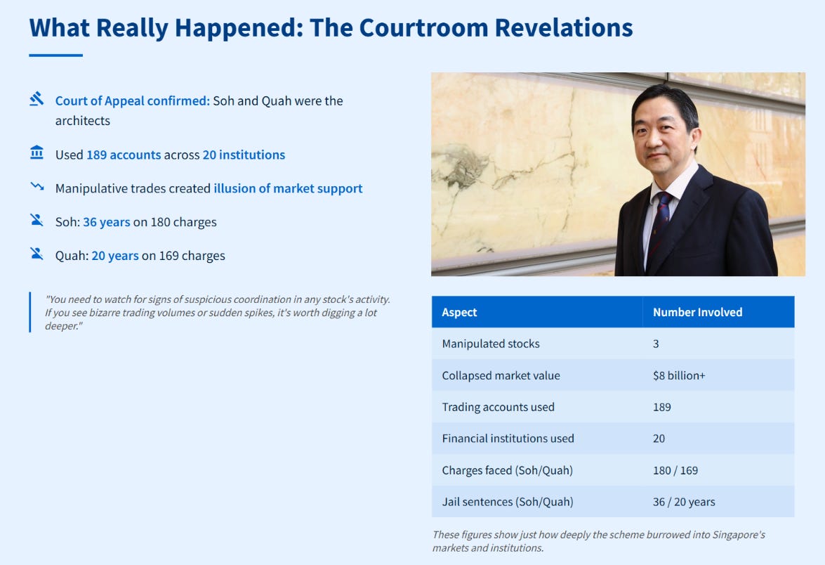 What’s unique in this case isn’t just the scale, but the sophistication. Manipulative trades created the illusion of market support, drawing in ever more buyers while insiders cashed out. When cracks appeared, Soh brazenly tried to deflect blame onto others and even tampered with witnesses. The courts saw through it all.