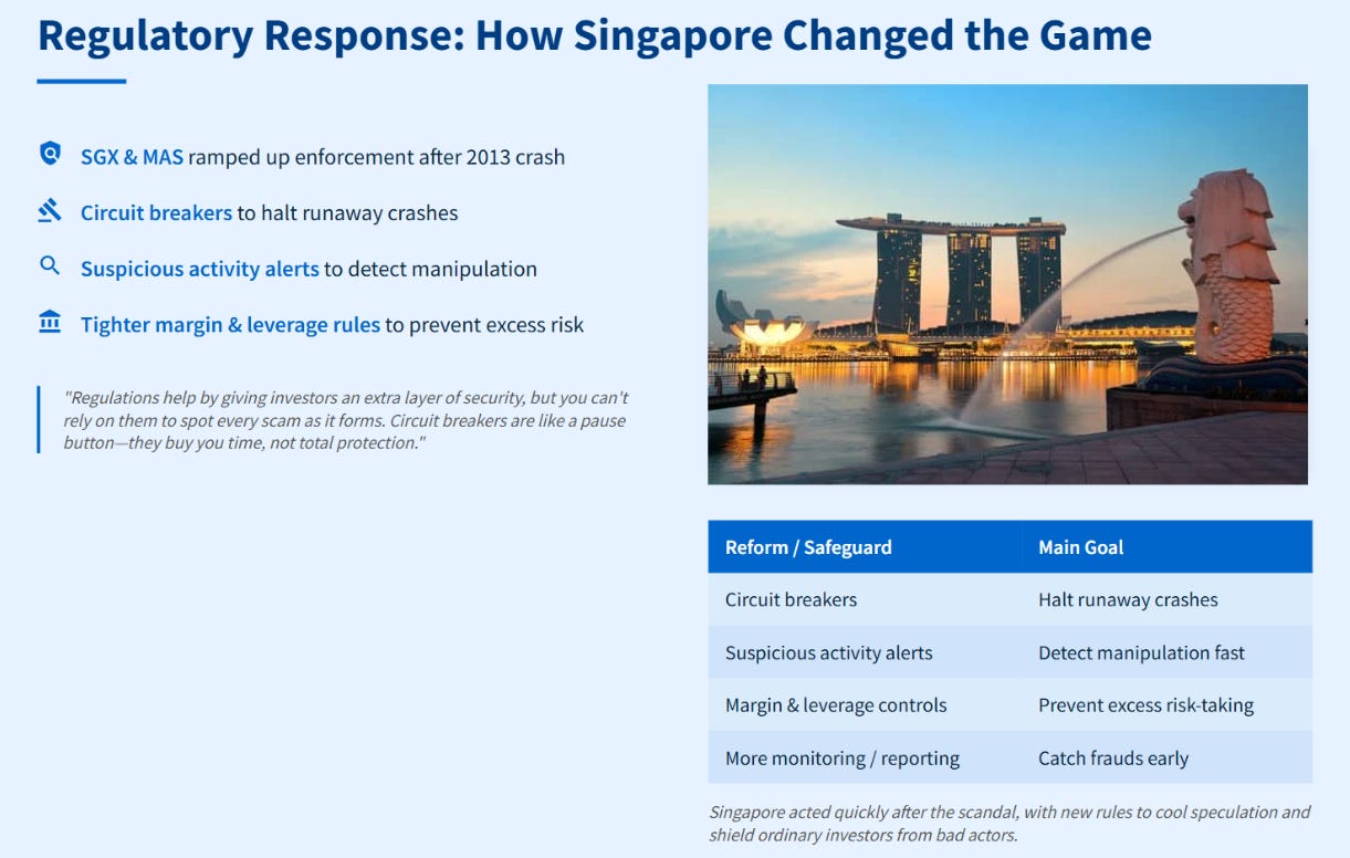 The penny stock crash was a watershed moment. The Singapore Exchange (SGX) and Monetary Authority of Singapore (MAS) ramped up enforcement, compliance, and monitoring. Circuit breakers, suspicious activity alerts, and tighter rules on margin and short selling became the norm after 2013.