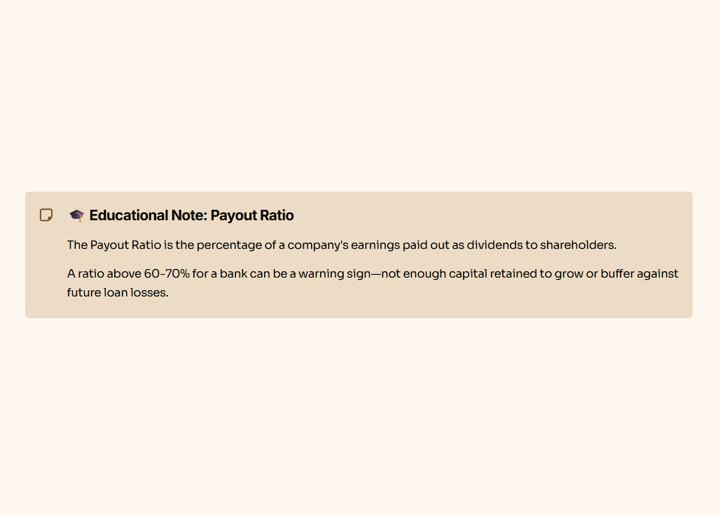 The Payout Ratio is the percentage of a company’s earnings paid out as dividends to shareholders. A ratio above 60-70% for a bank can be a warning sign that they are not retaining enough capital to grow or to buffer against future loan losses.