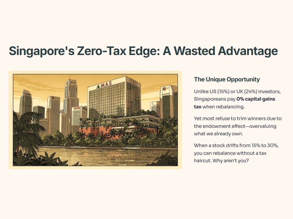 In Singapore, we have a unique “Zero-Tax Edge.” Unlike investors in the US or UK who lose 15% to 24% of their gains to the taxman when they rebalance, a Singaporean investor can trim a winner for a 0% tax hit. This makes the 25% rule even more powerful here. If a stock drifts from 15% to 30% of your portfolio, you can move that capital back to safety without a “tax haircut,” yet most investors refuse to do it because of the endowment effect—the psychological bias that makes us overvalue what we already own.