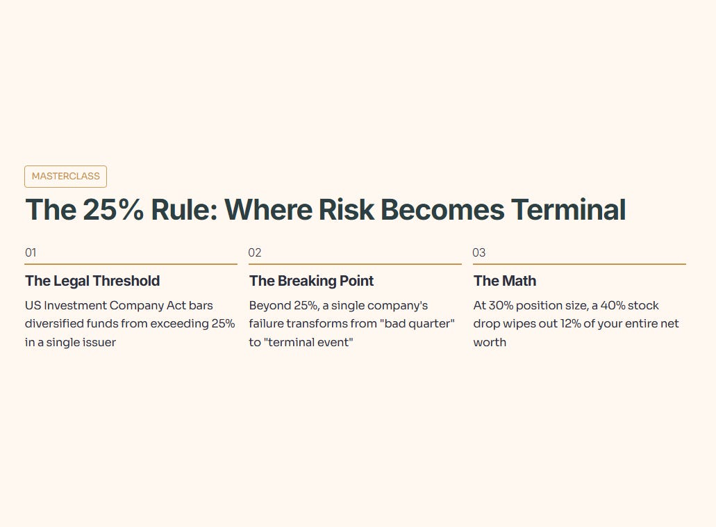 Before we look at the numbers, we need to understand why the “25% Rule” exists. In the professional world, specifically under the US Investment Company Act, a “diversified” fund is legally barred from putting more than 25% of its assets into a single issuer. This isn’t an arbitrary number; it is the point where a single company’s failure ceases to be a “bad quarter” and becomes a “terminal event” for your wealth.
