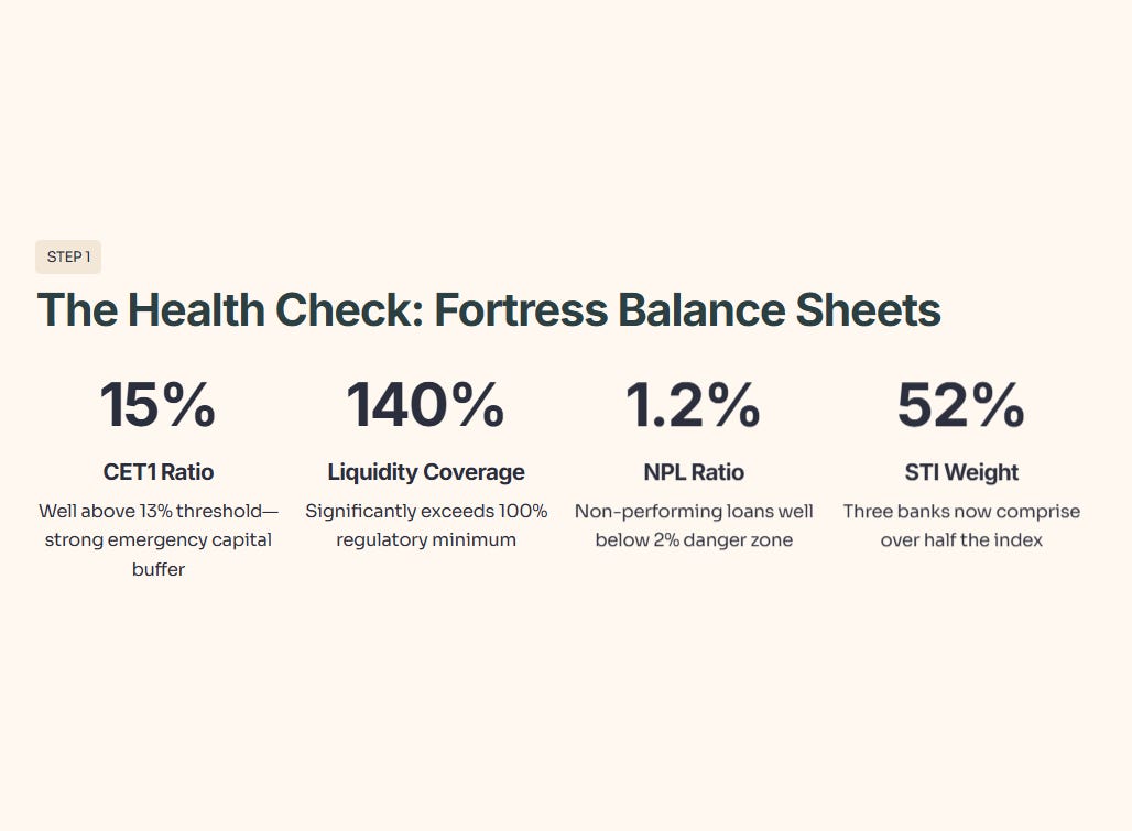 Before we can even talk about the mouth-watering dividends, we have to ask: can these banks actually pay their bills if the music stops? For a bank, “health” isn’t measured by net debt in the traditional corporate sense (since debt is their raw material), but by their Capital Adequacy Ratio and Solvency. DBS, OCBC, and UOB are currently sitting on “fortress” balance sheets, but the risk isn’t internal—it’s systemic. With the three banks now making up over 52% of the Straits Times Index, the health of your portfolio is now inextricably linked to the health of the Singapore government’s regulatory environment.